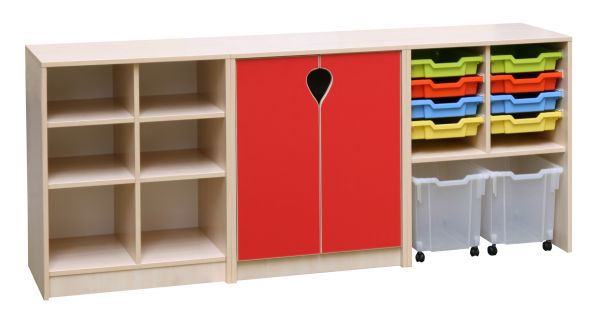 A Lili szekrénysor B kompakt, mégis sokoldalú tárolási megoldást kínál óvodai és bölcsődei környezetben. A nyitott polcos rész, a zárt ajtós elem és a görgős tárolók együttesen segítik a játékok és foglalkozási eszközök rendszerezett elhelyezését. A tálcák könnyen kivehetők, így a mindennapi használat és a rendrakás is egyszerűbbé válik. Az alacsony, stabil kialakítás biztonságos használatot tesz lehetővé a gyermekek számára. A bútor készreszerelt, azonnal használatra kész.