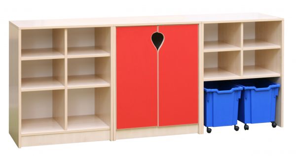 Lili szekrénysor C Kialakítás: nyitott polcos és középen ajtós elemmel kombinált szekrénysor görgős tárolókkal Felhasználás: óvoda, bölcsőde, csoportszoba, fejlesztő tér Szín: juhar, piros, kék Készreszerelt: igen Térbeállítható: nem Méret: 210x49x86 cm