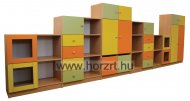 Színes bútoraink laminált bútorlapból készülnek, ABS élzárással. A szekrénysor elemei különböző színekben rendelhetőek, azok tetszőlegesen variálhatóak, így a csoportszoba egyedi igények szerint rendezhető be.