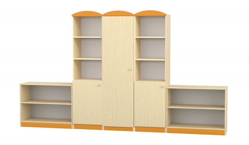 Az 5 elemből álló szekrénysor praktikus és jól átlátható tárolási megoldást kínál óvodai és intézményi környezetben. A középső szekrény és a két ajtós elem zárt tárolást biztosít, míg az alacsony, nyitott szekrények gyors hozzáférést nyújtanak a mindennap használt eszközökhöz és játékokhoz. A narancs színű díszítőelemek vidám, gyermekbarát megjelenést kölcsönöznek a bútornak. Az eltérő magasságú elemek dinamikus, mégis rendezett összképet alkotnak. Strapabíró, saját gyártású bútor, amely intenzív igénybevételre készült.