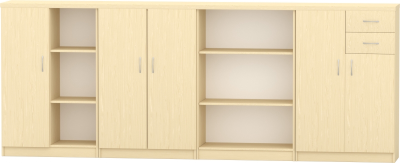 Irodabútor – Szekrénysor IV., 320x40x122 cm Kialakítás: 4 elemből álló szekrénysor, nyitott polcos és ajtós tárolóegységekkel, lekerekített ABS élzárással Szélesség: 320 cm Mélység: 40 cm Magasság: 122 cm Szín: juhar alapszín Készreszerelt: igen Térbeállítható: nem Felhasználás: iroda, iskola, közintézmény, irattár