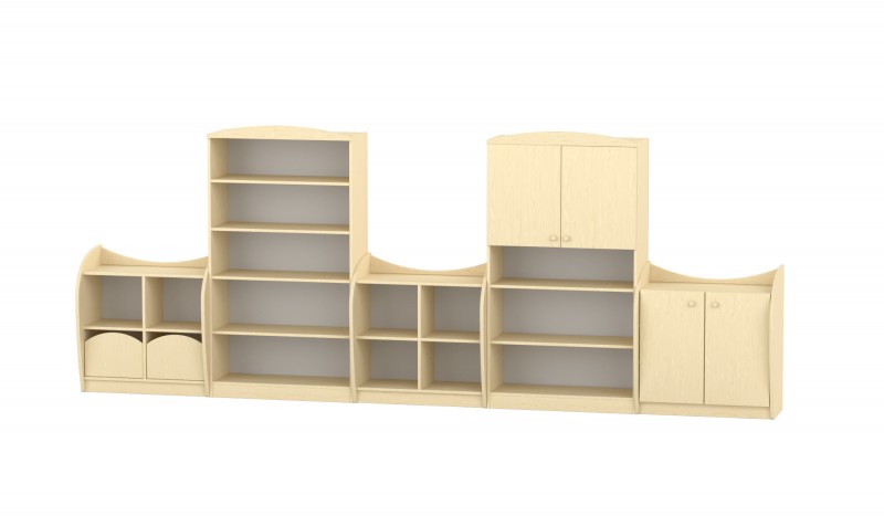 Szekrénysor, juhar XII. Az 5 elemből álló, kombinált óvodai szekrénysor ideális választás a csoportszobák rendezett és áttekinthető kialakításához. A különböző magasságú és funkciójú elemek változatos tárolási lehetőségeket kínálnak, így minden játék, eszköz és foglalkoztató anyag jól elfér benne. A két magas szekrény nagy tárolókapacitást biztosít, míg az alacsonyabb elemek könnyen elérhetők a gyermekek számára. Íves, lekerekített formavilága biztonságossá teszi a bútort, miközben barátságos, modern megjelenést kölcsönöz a térnek. Praktikus fakkok, polcok és zárt tárolók segítik a rendszerezést, így a szekrénysor tökéletesen illeszkedik óvodai és bölcsődei környezetbe. A szekrénysor elemei: 1. elem: kétfiókos elem – 2 fiókkal, 2 fakkal 2. elem: magas szekrény – 4 polcos, 5 fakkos 3. elem: alacsony polcos elem – 2 polcos, 2 fakkos 4. elem: magas szekrény – alul 2 polcos, 3 fakkos; felül 2 ajtós, 1 polcos 5. elem: kétajtós szekrény – belső polcos Íves, lekerekített, gyermekbiztonságos kialakítás