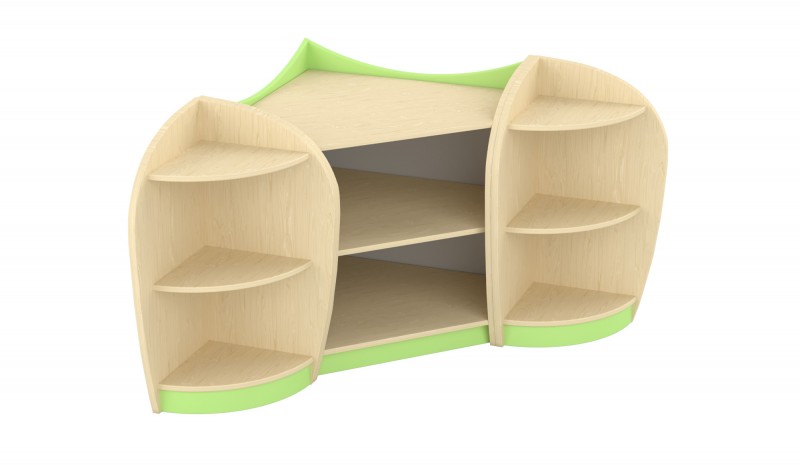 Sarokszekrény, VII. Ez a dekoratív sarokszekrény ívelt, lekerekített kialakításával biztonságos és barátságos megoldást kínál bölcsődei és óvodai terekbe. A központi, 1 polcos és 2 fakkos nyitott rész ideális a mindennap használt játékok vagy eszközök tárolására, míg a két oldalsó, kagylóformában ívelt polcelem további praktikus rakodófelületet biztosít. Az íves felsőperemnek köszönhetően a szekrény tetejéről semmi nem csúszik le, a lekerekített élek pedig maximális gyermekbiztonságot nyújtanak. Modern megjelenése bármely berendezésbe harmonikusan illeszkedik. Ívelt, lekerekített kialakítás Középső rész: 1 polcos, 2 fakkos Két oldalsó elem: egyenként 3 íves polccal Biztonságos, felsőperemes kialakítás – a tetejéről nem esik le semmi. Szín: juhar-zöld Készreszerelt termék. Térbeállítható: Nem Mérete: 163x75x86 cm