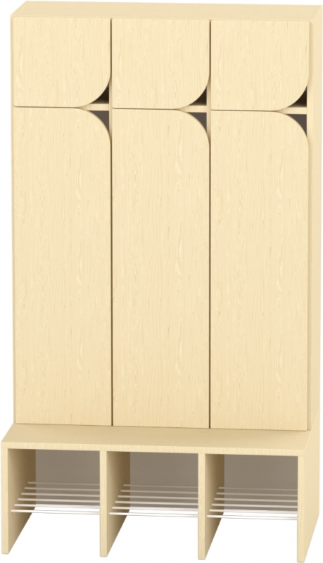 Gyermeköltöző 3 fős – alul-felül ajtós, rácsos cipőtárolós – juhar Kialakítás: felül és alul ajtós, alsó rácsos cipőtárolóval, ülőpados Férőhelyek száma: 3 fő Alapszín: juhar Készreszerelt: igen Térbeállítható: nem Termék szélessége: 78,5 cm Mélysége: alsó rész (ülőpad) 50 cm, felsőrész: 28 cm Magassága: 135 cm Ülésmagasság: 30 cm