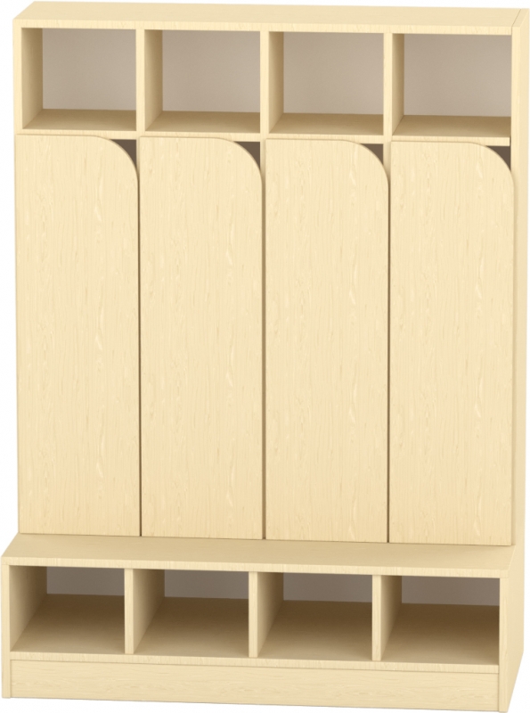 A 4 fős, alul ajtós gyermeköltöző rendezett és esztétikus tárolási megoldást kínál óvodai és bölcsődei környezetben. Az alsó ajtós rész lehetővé teszi a cipők és egyéb tárgyak zárt, átlátható elhelyezését, míg a felső nyitott rész gyors hozzáférést biztosít a ruháknak és személyes holmiknak. A stabil ülőrész kényelmes használatot nyújt a gyermekek számára, támogatva az önálló öltözést. Letisztult kialakítása jól illeszkedik intézményi terekbe. Az öltözőcsaládnak van 3 fős, 4 fős és 5 fős változata is, így biztosan összeállítható a csoportlétszámnak megfelelő öltöző mennyiség.
