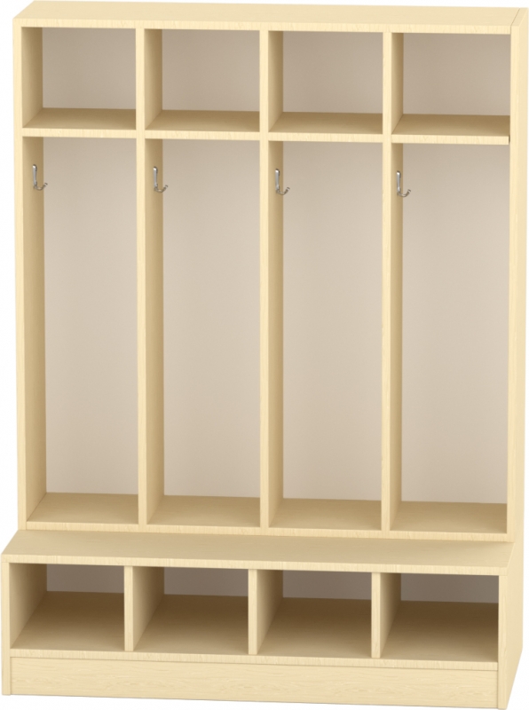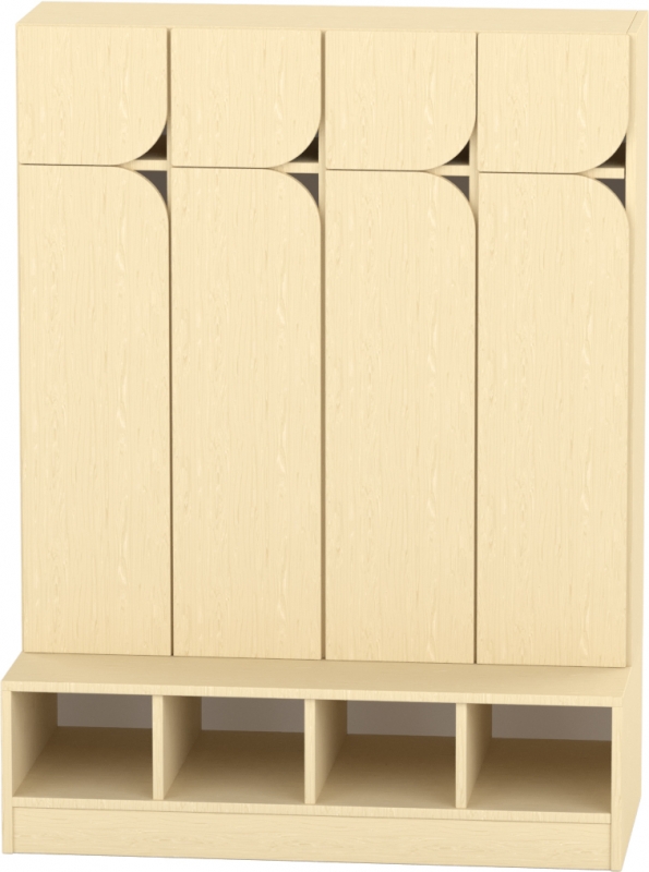 Gyermeköltöző 4 fős – alul-felül ajtós, polcos cipőtárolós – juhar Kialakítás: felül és alul ajtós, alsó polcos cipőtárolóval, ülőpados Férőhelyek száma: 4 fő Alapszín: juhar Készreszerelt: igen Térbeállítható: nem Termék szélessége: 104,2 cm Mélysége: alsó rész (ülőpad) 50 cm, felsőrész: 28 cm Magassága: 135 cm Ülésmagasság: 30 cm