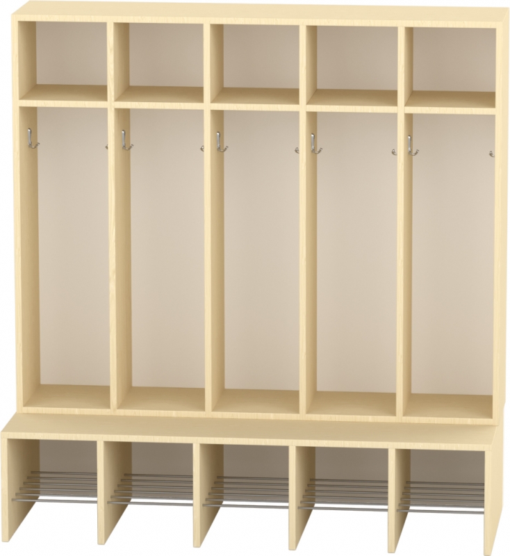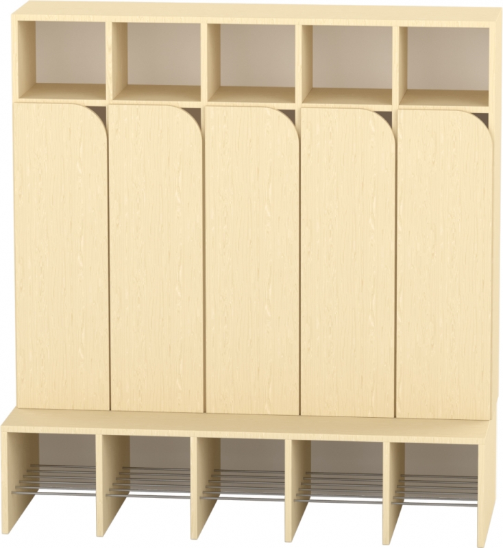 Az 5 fős, alul ajtós gyermeköltöző rácsos cipőtartóval praktikus és jól szellőző megoldást kínál óvodai és bölcsődei környezetben. Az alsó ajtós rész lehetővé teszi a cipők és személyes tárgyak esztétikus, zárt tárolását, miközben a rácsos kialakítás biztosítja a megfelelő levegőzést. A felső nyitott rész gyors hozzáférést nyújt a ruhákhoz, támogatva az önálló öltözést. A stabil ülőrész kényelmes és biztonságos használatot biztosít a gyermekek számára. Az öltözőcsaládnak van 3 fős, 4 fős és 5 fős változata is, így biztosan összeállítható a csoportlétszámnak megfelelő öltöző mennyiség.