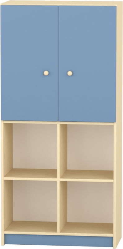 Tágas, hatfakkos tárolószekrény praktikus felső, zárt résszel A nyitott alsó rekeszek gyors hozzáférést biztosítanak a mindennapi eszközökhöz A felső, teliajtós tároló rész rendezett és porvédett elhelyezést kínál Stabil, gyermekbarát kialakítás lekerekített élekkel Szín: juhar–acélkék ajtókkal Készreszerelt termék Térbeállítható: nem Mérete: 80×40×168 cm