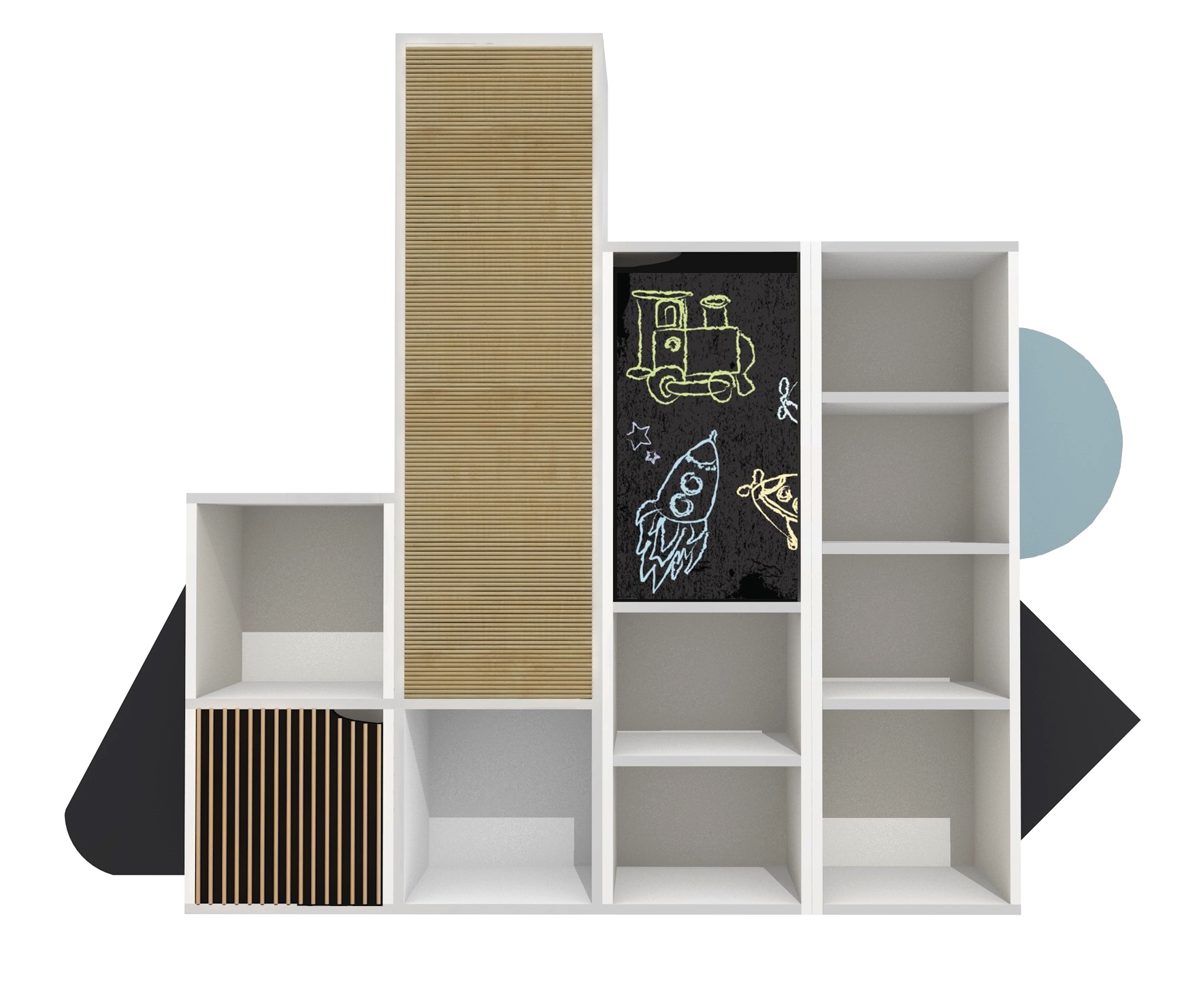 A 160 cm széles és 168 cm magas szekrény vonat formájával már első pillantásra elvarázsolja a gyerekeket, és hívogat, hogy fedezzék fel a belsejét. A bútor praktikus elrendezésének köszönhetően különböző méretű nyitott és zárt rekeszeket kínál, így minden játék, könyv vagy eszköz könnyen elpakolható — és gyorsan elővarázsolható, ha szükség van rá!