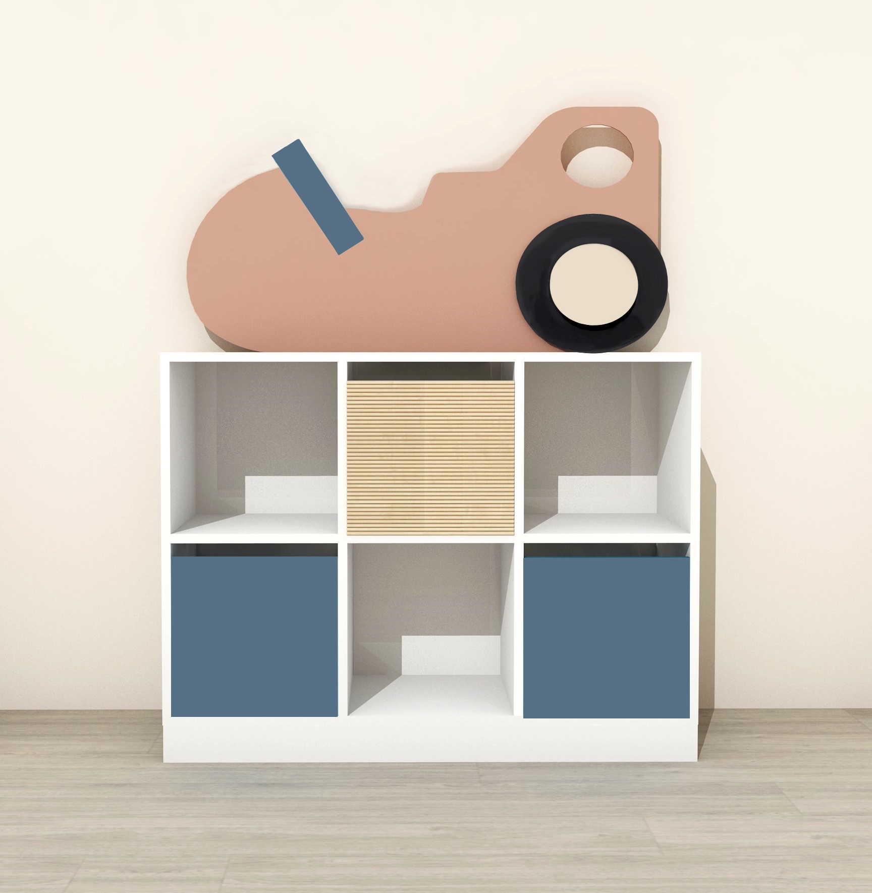 A 115 cm széles, 88 cm magas szekrény (a díszelemmel együtt 147 cm) nyitott és zárt rekeszei segítenek a játékok, könyvek és eszközök rendszerezésében, a 3D-s versenyautó díszelem pedig garantáltan a gyerekek kedvence lesz.