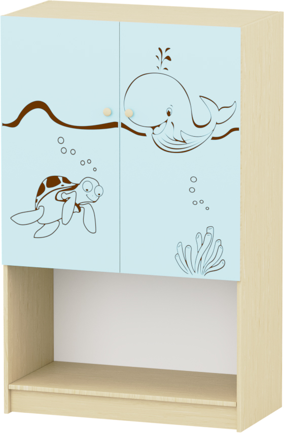 Sziluett Vízivilág 1 polcos, 2 fakkos, 2 ajtós szekrény - pasztellkék-juhar 80x40x128 cm, Anyaga: laminált bútorlap, lekerekített ABS élzárással. A bútor alapszíne juhar, a frontok színe választható.