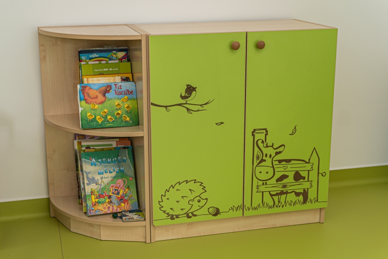 Varázsoljuk egyedivé a csoportszobát a Sziluett Vízivilág és a Sziluett Meserét bútorcsaláddal! A kedves figurák otthonosabb környezetet teremtenek a gyermekeknek. Az anyagában mintázott ajtók, fiókok díszei mind a bútornak, mind a csoportszobának. A bútor alapszíne juhar, a frontok színe választható. Anyaga: laminált bútorlap, lekerekített ABS élzárással.