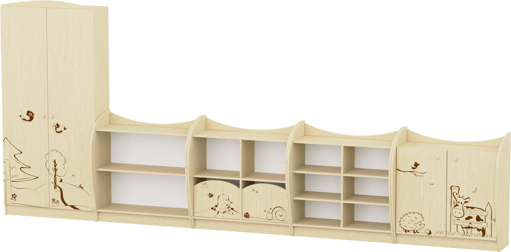 Kétfiókos kisszekrény, mezei állatos motívumokkal A bútor jellegzetessége a lágyan ívelt, szélesebb oldalelem, amelynek köszönhetően a polc kissé beljebb kerül, stabil és biztonságos elrendezést biztosítva. A felsőíves színes betét és az alsó, hozzá illő lábazat modern megjelenést ad. A kedves, mart mintás előlapokkal díszített szekrény játékos és barátságos hangulatot teremt a gyerekszobában vagy óvodai térben. A finoman megmunkált motívumok – például a kisvakond, csiga és a madárka – letisztult, természetközeli vonalvezetéssel készültek, amelyek időtálló megjelenést biztosítanak. A felső nyitott polcok könnyű hozzáférést adnak a mindennap használt játékokhoz, míg az alsó, mart mintás elemek esztétikusan rejtenek el kisebb holmikat. A mart díszítés időtálló, nem kopik le, és hosszú távon is megőrzi különleges, barátságos esztétikáját. A teljes konstrukció lekerekített élei és íves sarokkialakítása biztonságos választássá teszik bölcsődés és óvodás környezetbe egyaránt. A bútor 2 fiókos kialakítású. A fiókok fém síneken futnak, így használatuk stabil, (a fiókok nem esnek ki) biztonságos. A túlnyúló, felsőperemes kialakításnak köszönhetően a kisszekrény teteje is pakolható, semmi nem esik le róla. Szín: juhar Készreszerelt termék. Térbeállítható: Nem Mérete: 82x38x86 cm