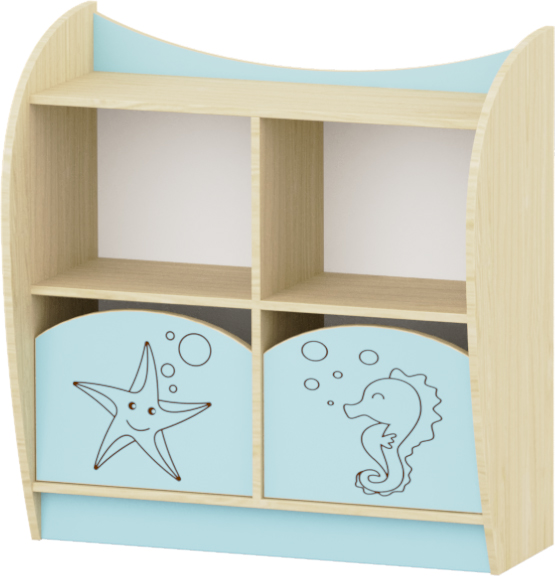 Szekrénysor, víziállatos motívumokkal A szekrénysor 4 részből áll: 1. elem: egy polcos, két fakkos tároló 2. elem: négy fakkos, két fiókos tárolóelem 3. elem: hat fakkos tárolóelem 4. elem: kétajtós, belül 1 polcos szekrény Formavilág: íves felső kialakítás, lekerekített oldalelemeka vidám mintákkal díszített szekrénysor játékos, barátságos hangulatot visz bármely gyerekszobába vagy óvodai csoportszobába. A különböző elemek mart motívumai – köztük a csillag, a csikóhal, a tenger alatti jelenetek és az aranyos állatfigurák – egyedi, mesés megjelenést teremtenek. A mart felület nem kopik le, tartós és esztétikus díszítést ad a szekrénynek, amely hosszú távon is megőrzi különleges megjelenését. A letisztult vonalvezetésű minták nem túl harsányak, mégis feldobják a bútort, így a tárolás élménnyé válik a gyerekek számára. Biztonság: éles sarkoktól mentes, gyermekbarát kivitel Felhasználás: bölcsődei és óvodai csoportszobákba ajánlott Szín: pasztellkék Készreszerelt termék. Térbeállítható: Nem Mérete: 328x38x86 cm