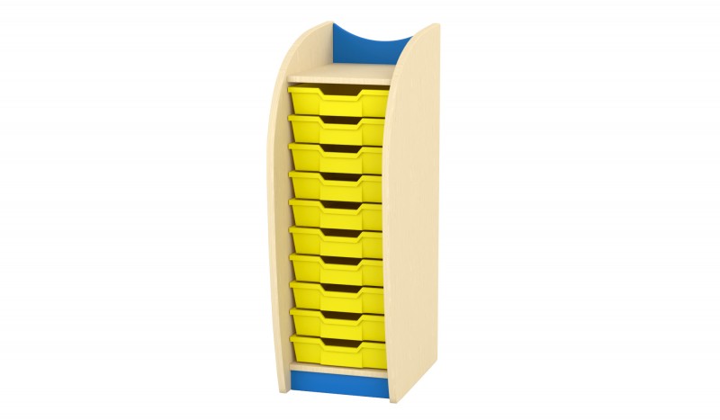 10 tálcás - juhar-kék, sárga tálcával. Mérete: 36x47x103 cm, tálca mérete: 312x427x75 mm, anyaga: Laminált bútorlap ABS élzárással. 10 db műanyag tálca Kiválóan alkalmas bölcsődei, óvodai csoportszobába, íves kialakítása miatt. Készreszerelt termék.