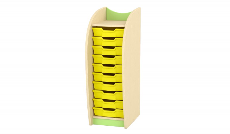 Tárolószekrény 10 műanyag tálcáva A kisgyermekek számára is biztonságos kialakítású tároló, teljesen lekerekített szélekkel és sarkokkal, így nem okoz sérülésveszélyt. A modern megjelenést az ívelt oldalelemek adják, amelyek egyben stabil szerkezetet is biztosítanak. A bútorban 10 műanyag tálca kap helyet, amelyek könnyen mozgathatók a tartós műanyag síneken. A korpusz külső csavarozásmentes kialakítású, esztétikus és letisztult megjelenést nyújtva. A felső rész kialakítása megakadályozza, hogy bármi leessen róla, így biztonságosan pakolható. Szín: juhar-zöld