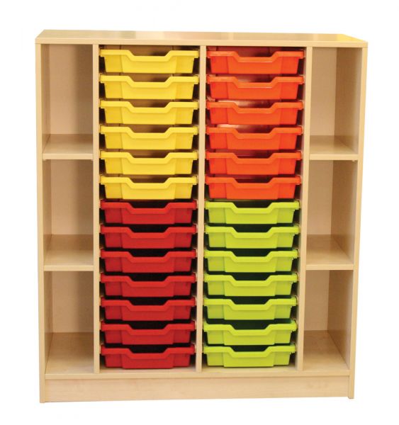 Ez a 26 db színes tálcával felszerelt tárolószekrény kifejezetten óvodai és bölcsődei környezetbe készült, elősegítve a játékok, fejlesztőeszközök és tanulási anyagok áttekinthető rendszerezését.