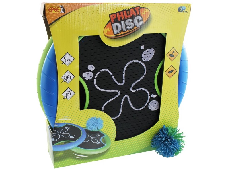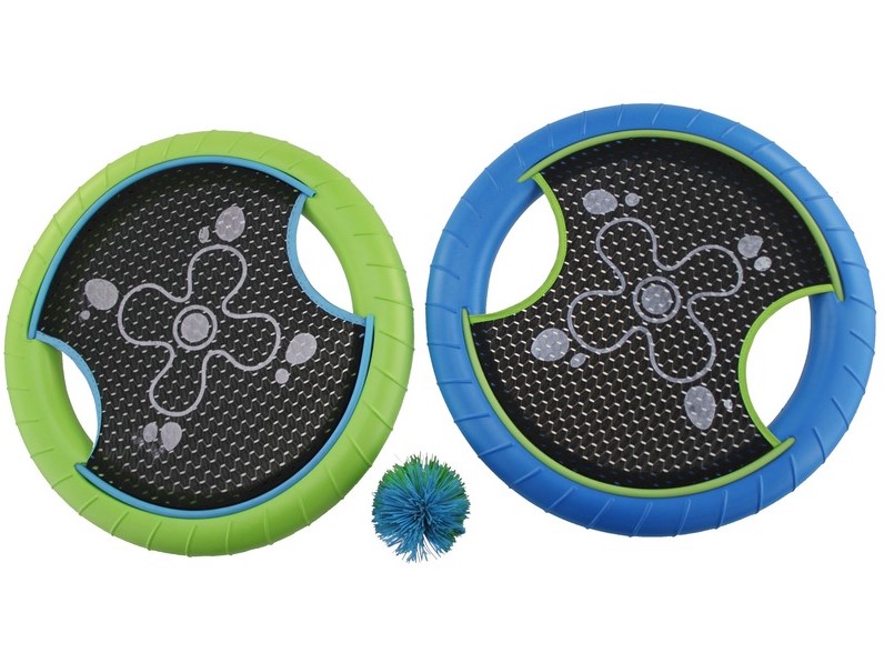 Ügyességi sportjáték 2 koronggal A készlet tartalma 2 db rugalmas hálójú korong ütő és 1 db szőrmók labda A korong átmérője 30 cm, a labda átmérője 8 cm.