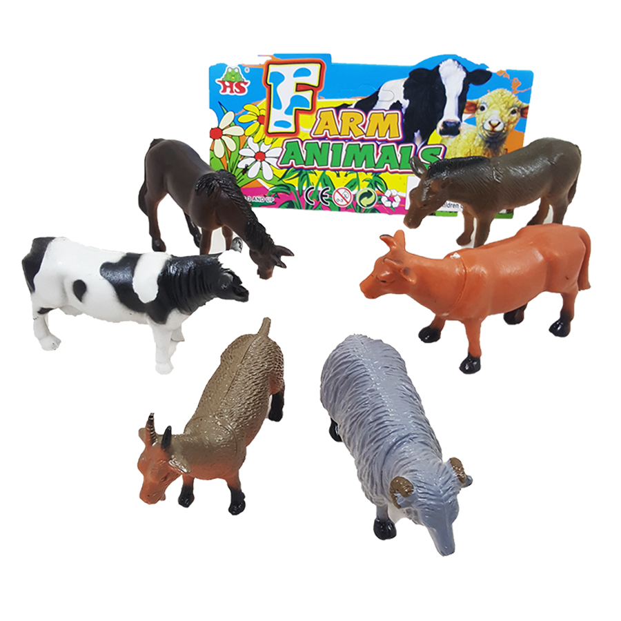 6 db-os vadállatkészlet puhább műanyagból. Az állatok hossza kb.: 10-12 cm. Tartalma: kecske, szamár, tehén, bika, juh és ló.