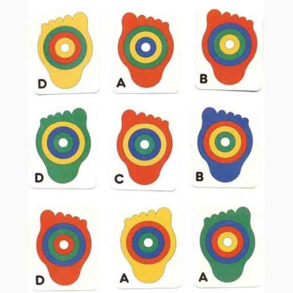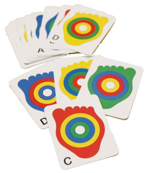 A lábunkra csatolt kiinduló korong segítségével célirányos lépegetéssel szedjük össze növekvő sorrendben az egymásra illeszkedő habszivacs karikákat. A mintakártyák felhasználásával színenkénti sorrendjüket is meghatározhatjuk.