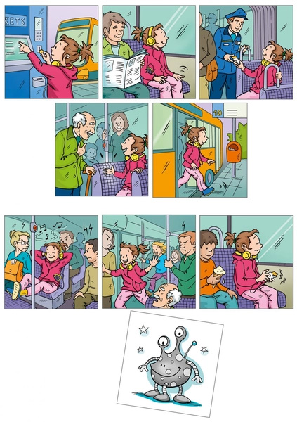 A képdoboz kis hétköznapi történetei segítik a gyerekeket abban, hogy megismerkedjenek a társadalmi szabályokkal, és megkönnyítik számukra azok alkalmazását.Minden esetben öt kártya alkot egy önálló, zárt sorrendet, amely egy adott helyzet lefolyását és az ahhoz kapcsolódó, társadalmilag elvárt viselkedést mutatja be.Emellett mindig három jelenet is található, amelyek az adott helyzetben nem kívánatos viselkedést ábrázolják.A jelenetek beszélgetésindítóként szolgálnak, és elősegítik a szabad beszédet és történetmesélést. Ugyanakkor alkalmasak egy adott iskolai esemény előkészítésére vagy utólagos megbeszélésére is.A kiegészítő kártyákon szereplő földönkívüliekhez a gyerekek hozzárendelhetik a nem kívánatos viselkedést, és elmagyarázhatják, mit csináltak rosszul. Ezután azonosulhatnak a helyesen viselkedő szereplőkkel.Témák:– Étkezés étteremben– Vásárlás a szupermarketben– Nyilvános WC használata– Könyvkölcsönzés könyvtárból– Utazás tömegközlekedéssel– Úton az iskolába– Állatkert– Uszoda– Múzeum