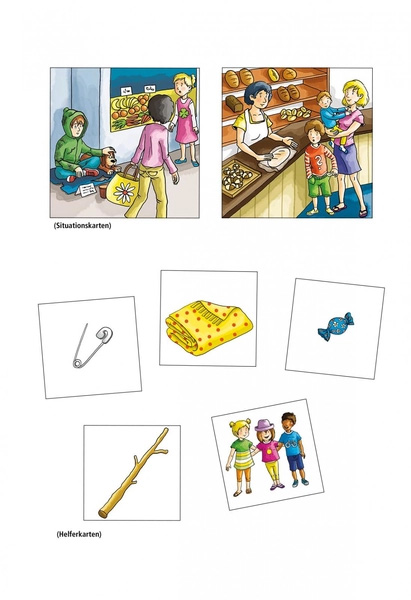 72 db 9x9 cm-es képkártya - 20 db szituációs kártya különböző hétköznapi szociális helyzetek bemutatására - 50 db segítő kártya (emberek, állatok és tárgyak ábrázolásával) - 2 db Joker kártya - használati útmutató