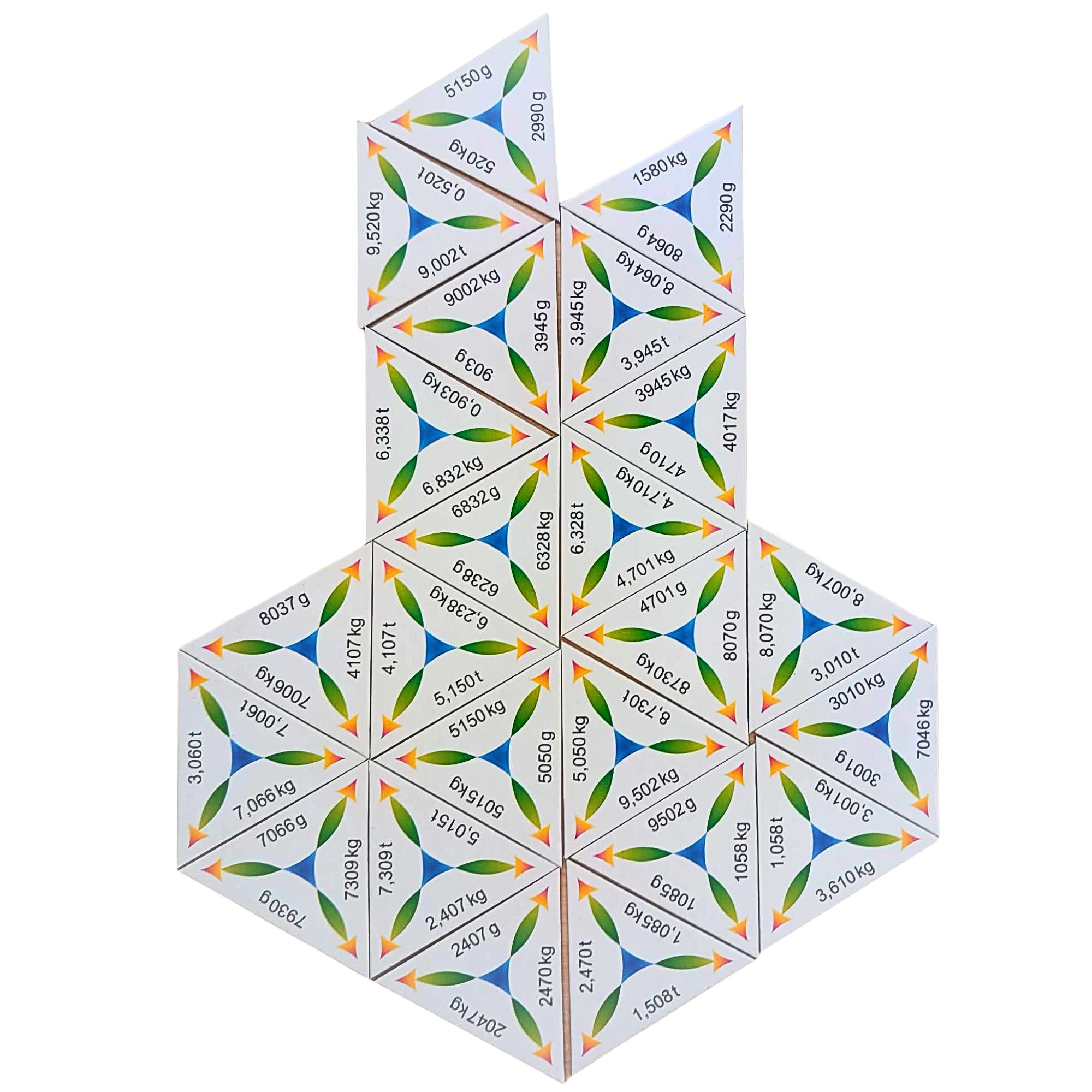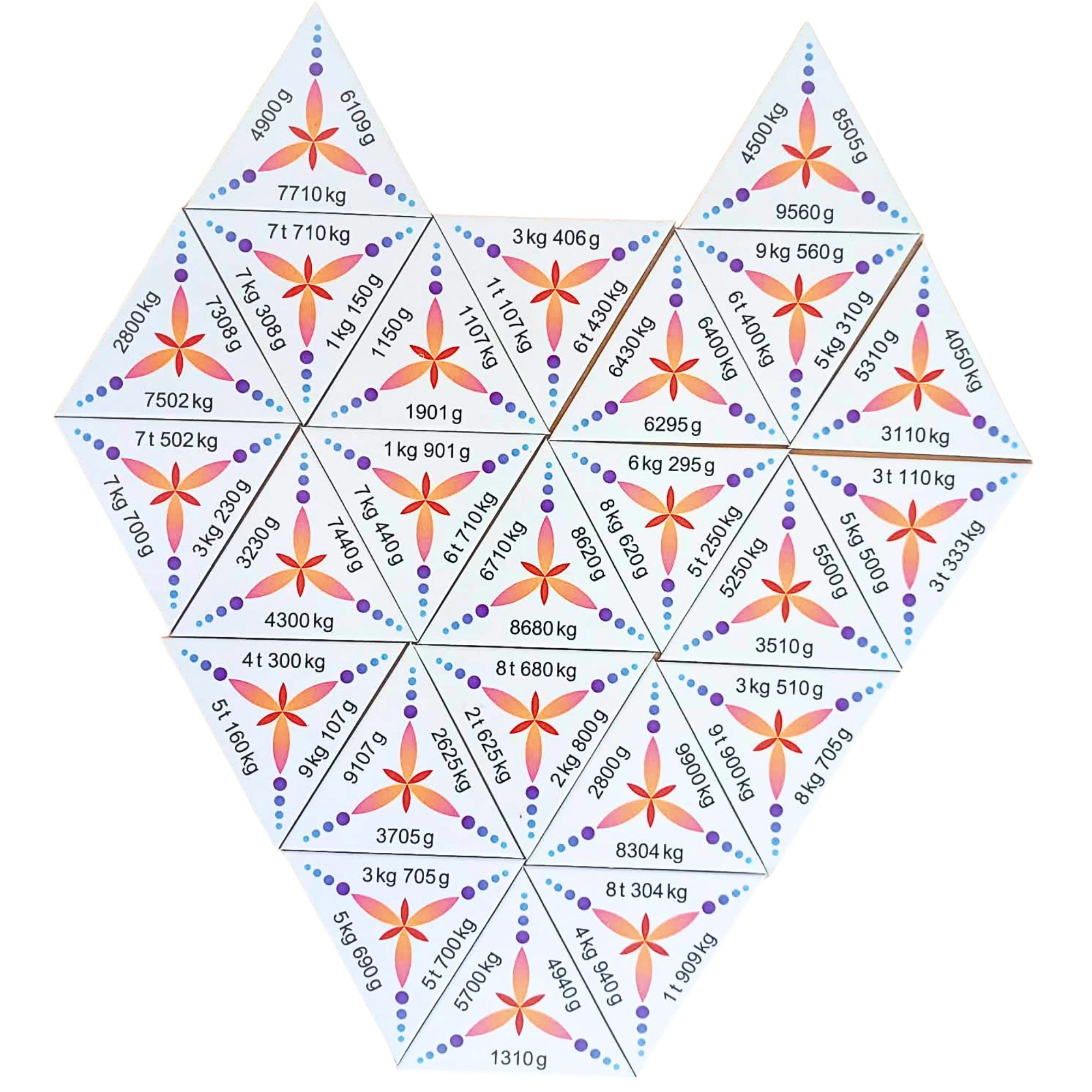 Nagyszerű a már megismert váltások begyakorlására, a folyamat automatizálására. A gyerekek szeretik, ahogyan különböző alakzatokat adnak ki a háromszögek helyes megoldásaik nyomán. Egyszerre többen is játszhatják. Minél több háromszöget tesznek egymás mellé, annál több választási lehetőségük van a következő példára. Így biztosított a fokozatosság és a sikerélmény. Egyszerre gyakorolhatjuk a kicsiből nagyba, illetve a nagyból kisebbe való váltásokat.