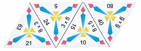 Schubitrix – Szorzás 100-ig Kialakítás: dominóelvű fejlesztőjáték Fejlesztési terület: matematika, szorzás 100-ig, logikai gondolkodás Tartalma: 48 db háromszög alakú kártya Ajánlott korosztály: kisiskolás korosztály Felhasználás: iskola, fejlesztő foglalkozás, otthoni tanulás
