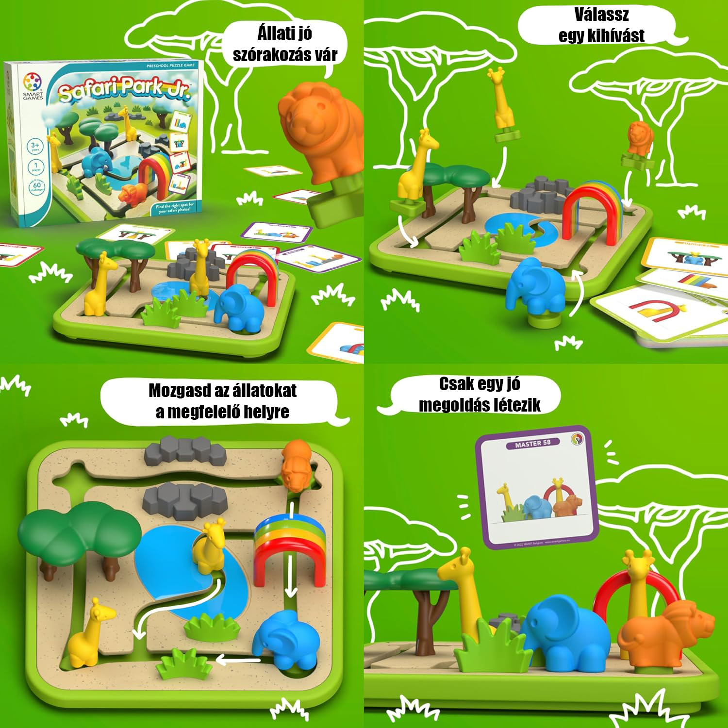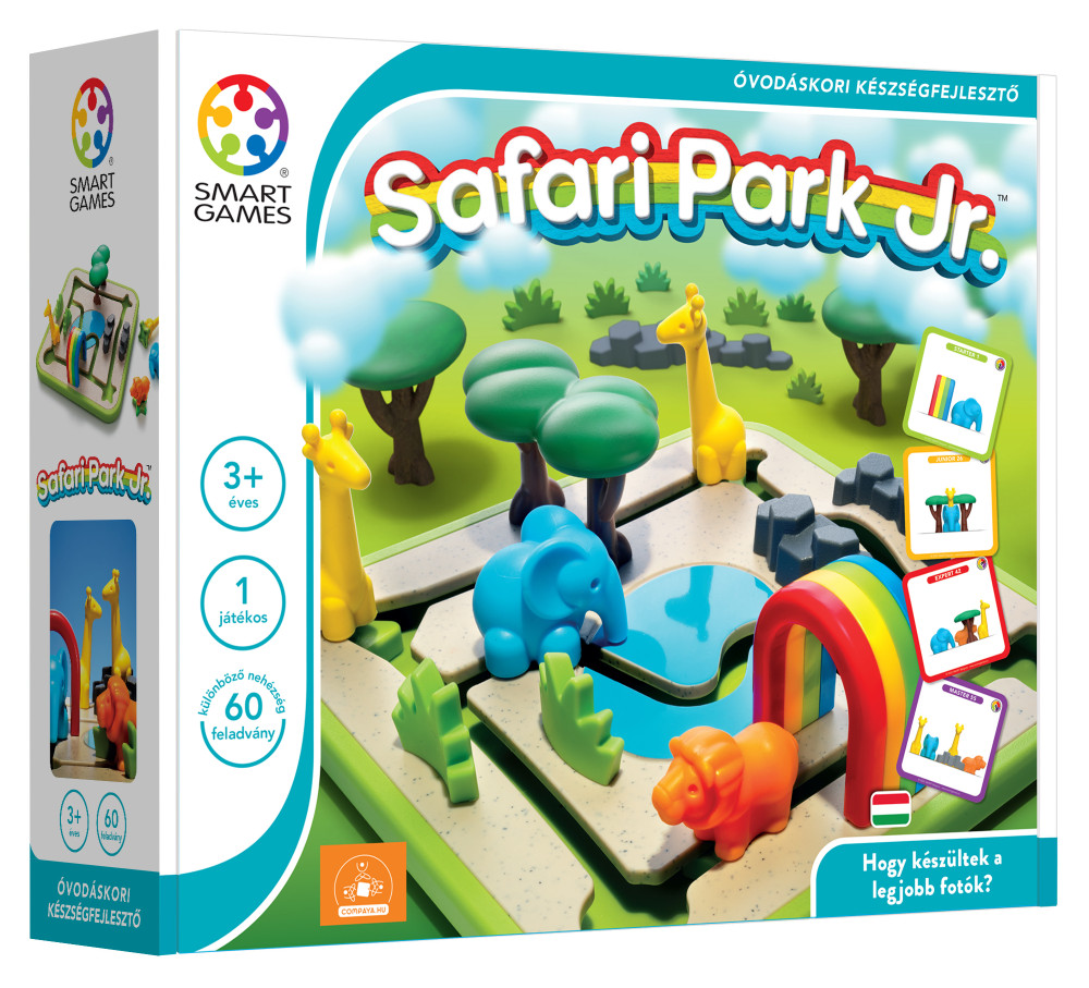 A Smart?Games „Safari Park Jr.” egy szórakoztató és fejlesztő-logikai játék kisgyermekek számára, melyben az állatok mozgási szabályok szerint kerülnek elhelyezésre a szafáriparkban. A játék célja a 60 különböző feladvány megoldása, mely során a gyermekek gyakorolják a térbeli viszonyokat (pl. bal-jobb, előtte-mögötte), a problémamegoldást és a szem-kéz koordinációt. Ideális óvodai és otthoni fejlesztőhelyzetekben.