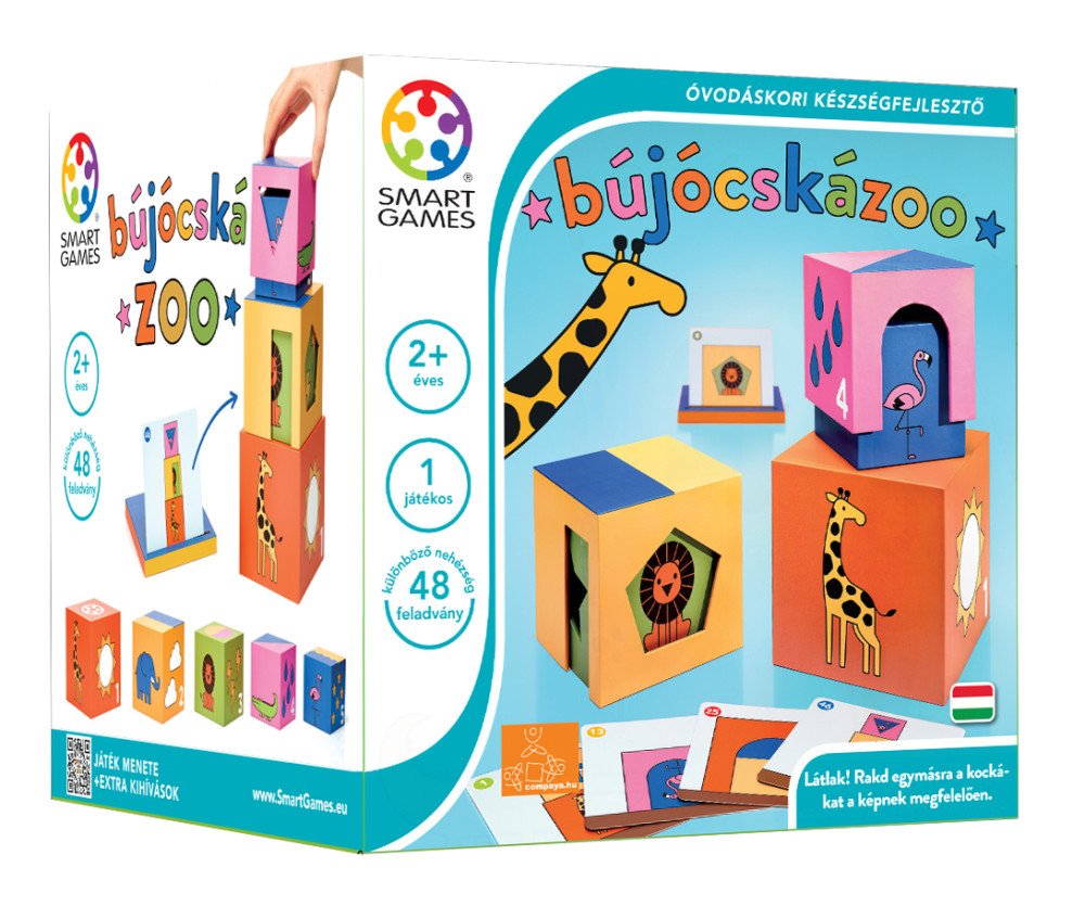 A Smart Games BújócskáZoo logikai játék feltárja az állatok rejtett mozgását: a kis játékosoknak rá kell jönniük, melyik állat merre bújt el a kerítésen belül. A játék segítségével a gyermekek fejlesztik a logikai gondolkodásukat, a következtetési képességüket és a tér-irány fogalmaikat. Ideális választás óvodai, fejlesztőcsoportos vagy otthoni játékidőhöz.