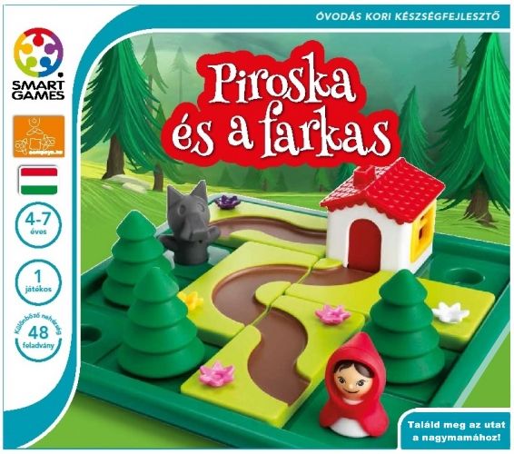Tartalma: - 48 db feladvány - 1 db tábla - 1-1 db farkas, piroska és házikó bábu - 3 db fenyőfa bábu - 5 db útvonal lapka