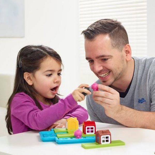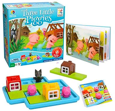 A három kismalac meséje alapján készült ez a kedves kis logikai játék, melyhez egy fokozatosan nehezedő 48 db feladványfüzet is tartozik, ami 24 nappali és 24 éjszakai feladványból áll.