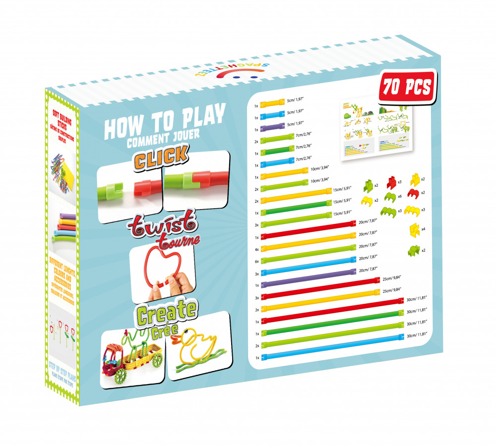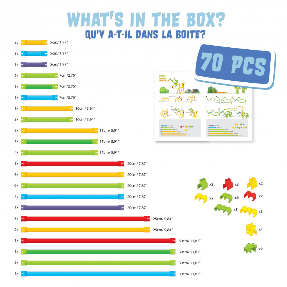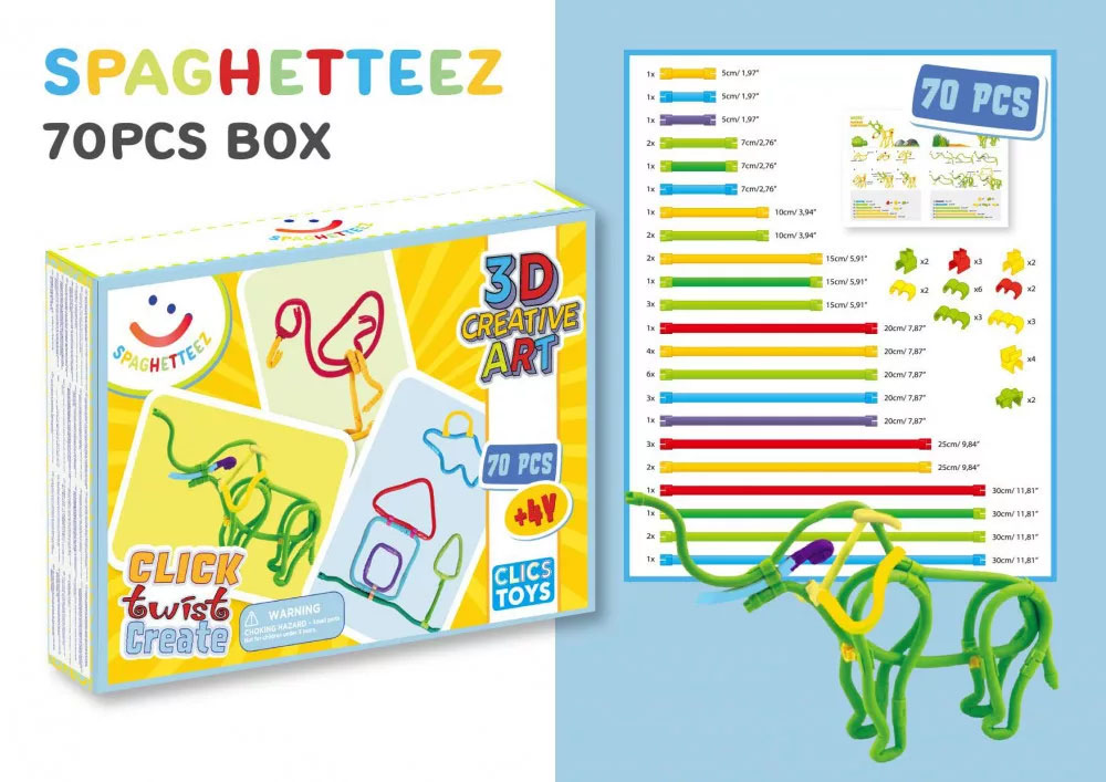 A Spaghetteez 70 darabos építőjáték egy kreatív, hajlítható rudakból és csatlakozókból álló készlet, amely lehetővé teszi a gyerekek számára, hogy szabadon alkossanak különféle formákat, figurákat és szerkezeteket.
