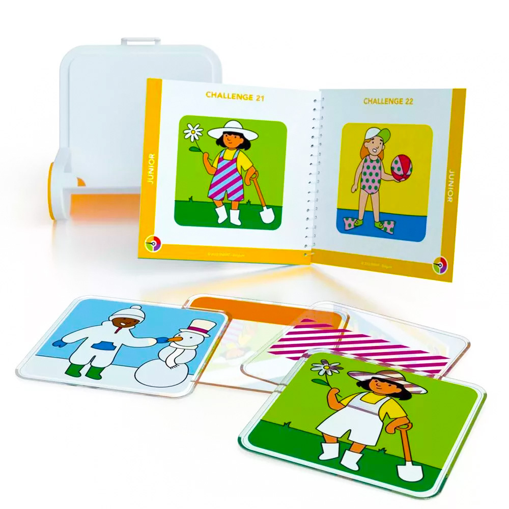 A doboz tartalmaz játéktartót, színes mintás lapkákat és figura lapkákat, valamint a feladatfüzetet megoldásokkal együtt.