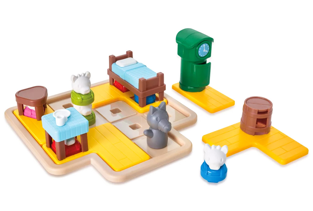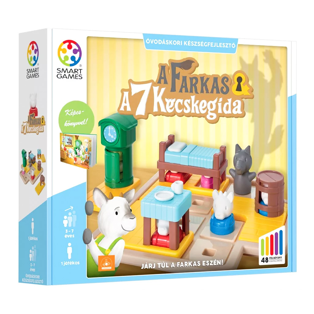 A farkas és a 7 kecskegida-Smart games Tartalma: 1 farkas figura, 7 kecskegida figura, 3 bútor elem, 1 játéktábla, 1 feladványfüzet és 1 mesekönyv Anyaga: műanyag, kartonpapír Játékosszám: 1 fő Ajánlott életkor: 3 éves kortól Feladványok száma: 48 Doboz mérete: kb. 30x24x6 cm Fejlesztett készségek: logikai gondolkodás, vizuális észlelés, következtetés, térbeli tájékozódás. Ajánlott korosztály: 3 -7 év