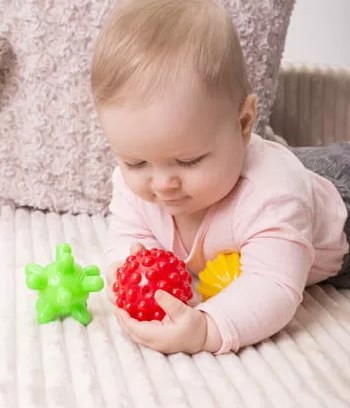 Érzékelőlabda-szett, amely segíti a babák érzékszervi fejlődését. A szett tartalma 3 db különböző méretű és textúrájú színes (zöld, piros, sárga) labda, amelyek elősegítik a motoros, tapintási, vizuális készségek fejlődését. Biztonságos és tartós anyagokból készül.