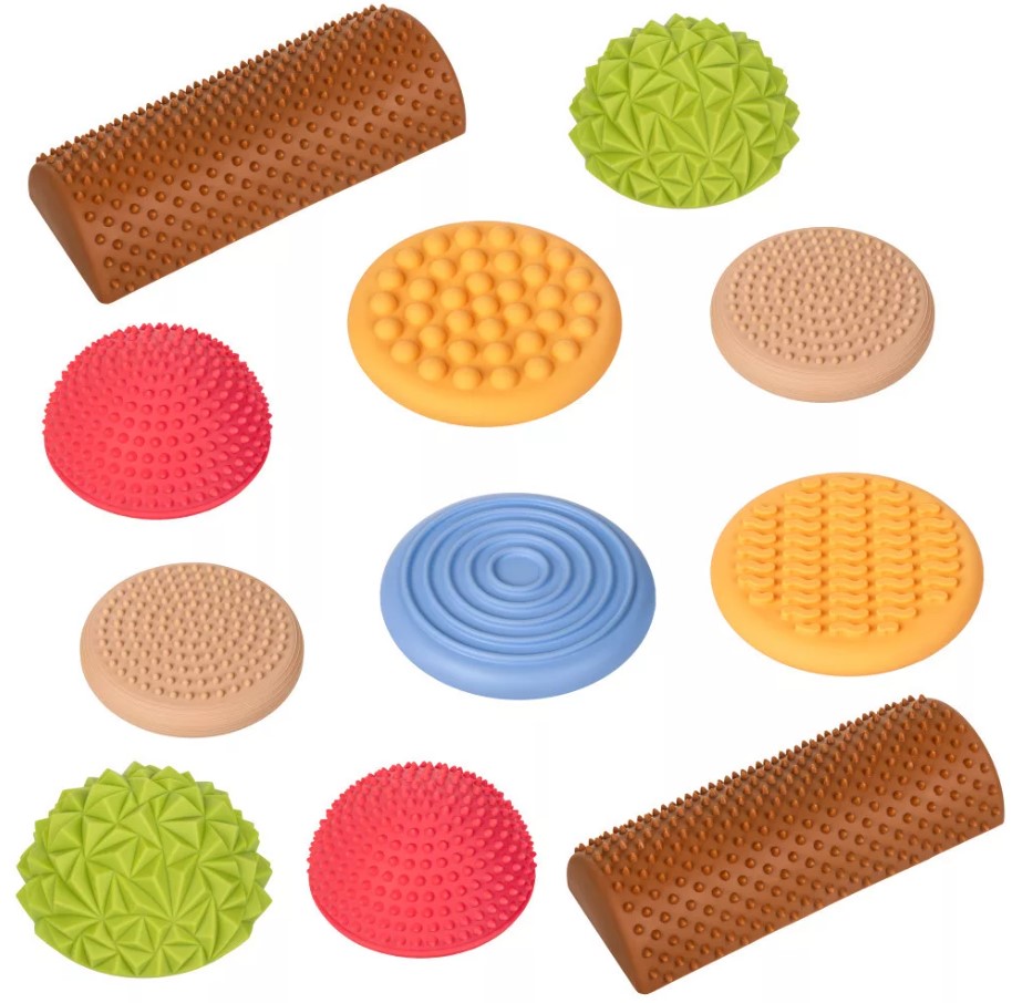 Többfunkciós fejesztő eszköz szett, amely fejleszti az egyensúlyérzékét és mozgáskoordinációt. Tartalma 6 db különböző színű és textúrájú érzékelő elem Ftalát- és BPA-mentes, biztonságos műanyagból. Maximális terhelhetőség: 100 kg. Méretek:1 db – Ø 19 cm, 1 db – Ø 16 cm, 1 db – Ø 17 cm, 1 db – 25 × 15 cm, 1 db – Ø 18 cm, 1 db – Ø 20 cm