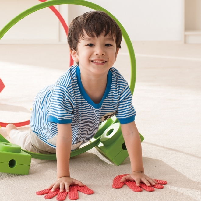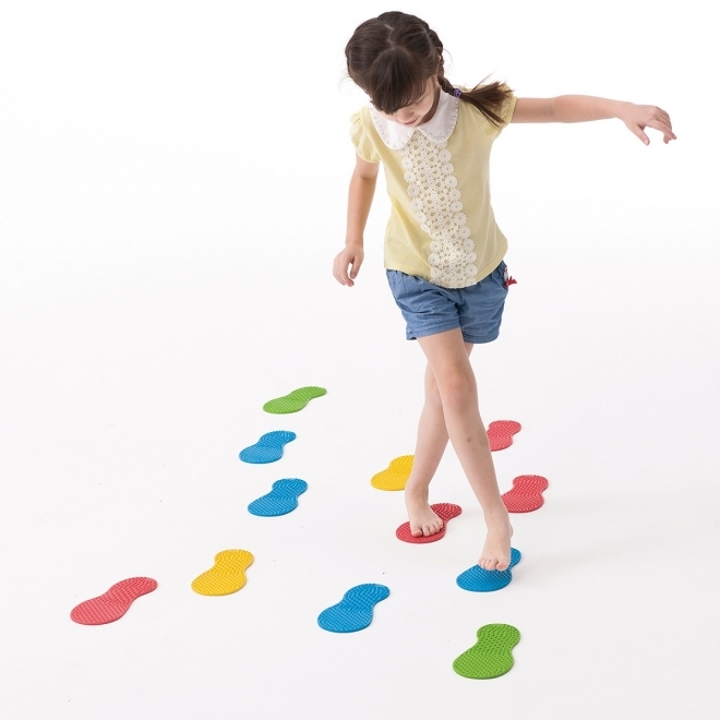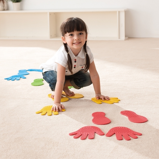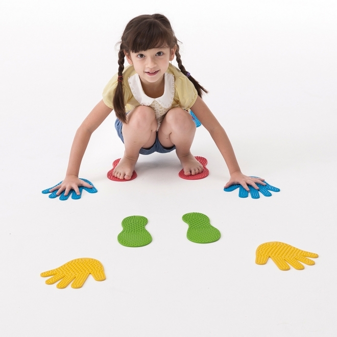 Tartalma: 6 pár láb forma és 6 pár kéz forma Csak a megfelelő formára helyezhetjük a végtagjainkat. A kéz- és lábformákat egymástól távolabb helyezve, az egyensúlyi helyzetet is meg kell találnunk. A készlet segít a szem-kéz, szem-láb koordinációban és az oldaliság elsajátításában. Az érzékelést és a csúszásgátlást segíti a formák bütykös felülete. A láb formák hossza: 22 cm A kéz formák hossza: 19 cm Vastagságuk: 0,5 cm