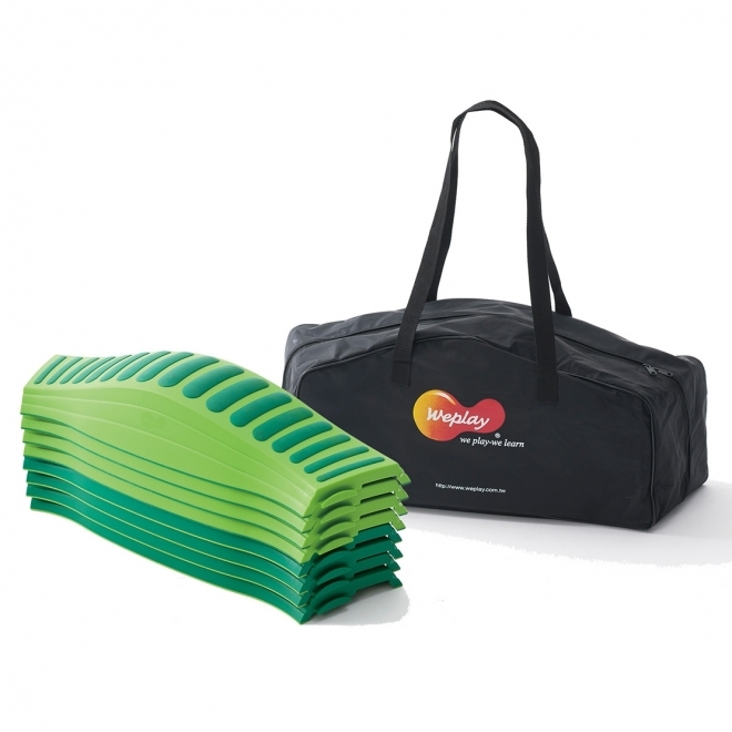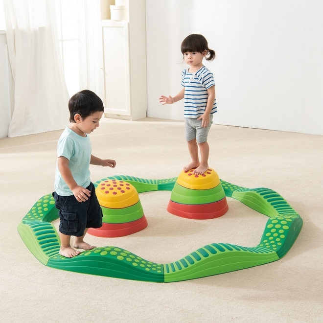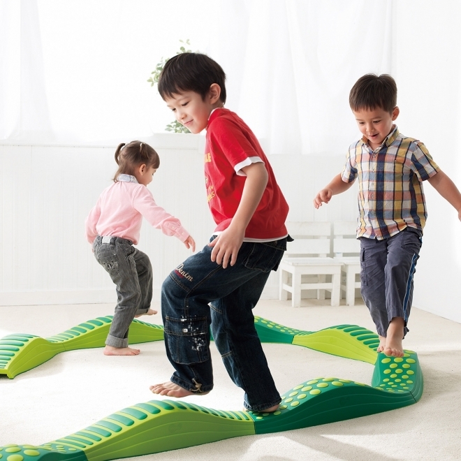 A hullámos elemekből és a folyami kövekből az összekötő elemek segítségével változatos egyensúlyozó pályát építhetünk. A különböző magasságú, mintázatú, érdes felületeken egyensúlyozva fejlődik a gyermekek koordinációja, egyensúlyozó képessége, taktilis észlelése. Ez kell majd a mozgáshoz!