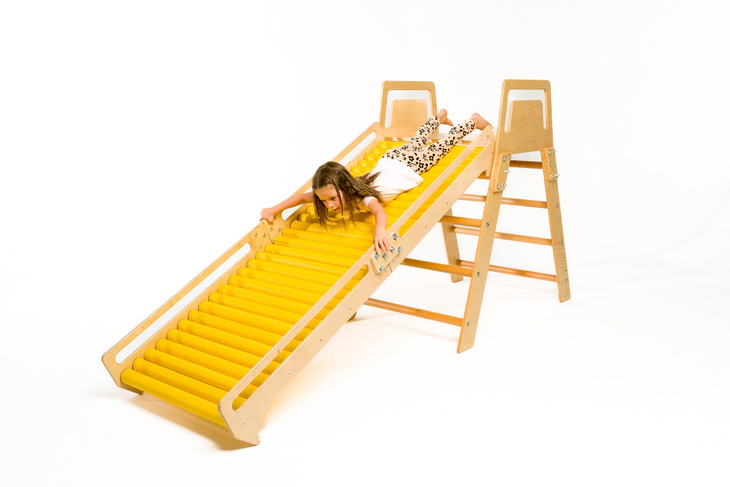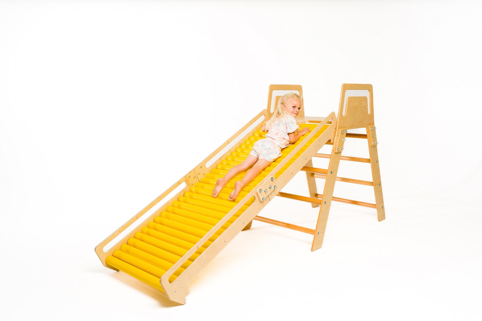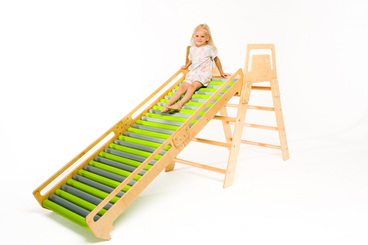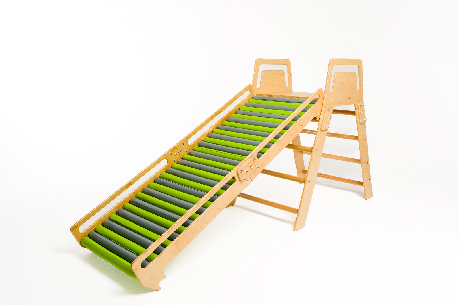 Szivacs görgős terápiás csúszda létrával - Tartalma: csúszda, létra, 32 db görgő - Anyag: lakkozott rétegelt lemez, bükkfa, szivacs borítás - Felhasználás: szenzoros integrációs terápia, mozgásfejlesztés - Tulajdonságok: kétirányú használat, kapaszkodók, stabil szerkezet - Rögzítés: önállóan használható vagy bordásfalhoz rögzíthető - Görgők: szivacs borítású - Maximális terhelhetőség: 90 kg - Méret: 250x120 cm