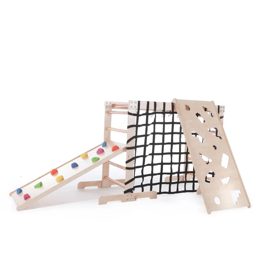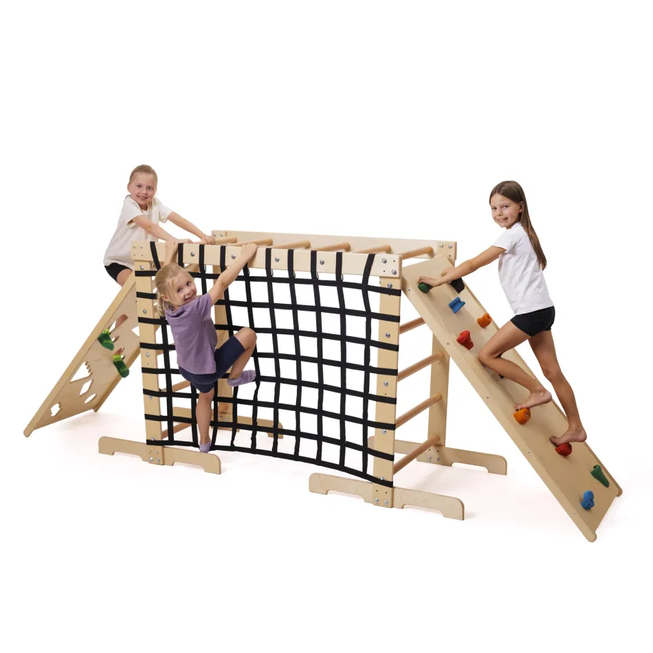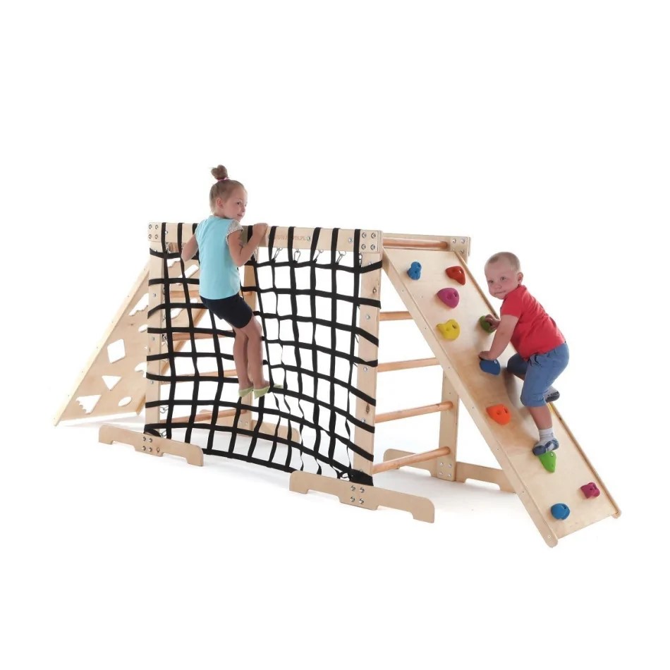 Szenzoros integrációs mászóház - alapkészlet - Tartalma: fa mászólétra, mászóháló, 2 db mászófal - Felhasználás: szenzoros integrációs terápia, mozgásfejlesztés - Tulajdonságok: többféle mászófelület, célzó feladatokra alkalmas kivitel - Kialakítás: stabil fa szerkezet - Anyag: fa - Méret: 210x75x125 cm - Maximális terhelés: 90 kg. Eséscsillapítő szőnyeg javasolt hozzá!