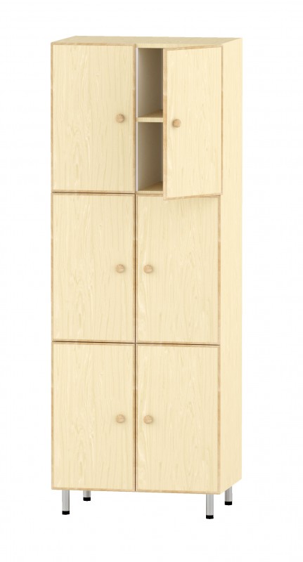 Gyermek öltözőszekrény. Mérete: 66x45x180 cm - 6 rekeszes, belül polcos, akasztós, kívül ajtókkal, fa gomb fogantyúkkal ellátott szekrény. Anyaga: juhar laminált bútorlap - lekerekített keményfa élzárással. Fém lábakon áll. készreszerelt termék, külső csavarozás mentes.