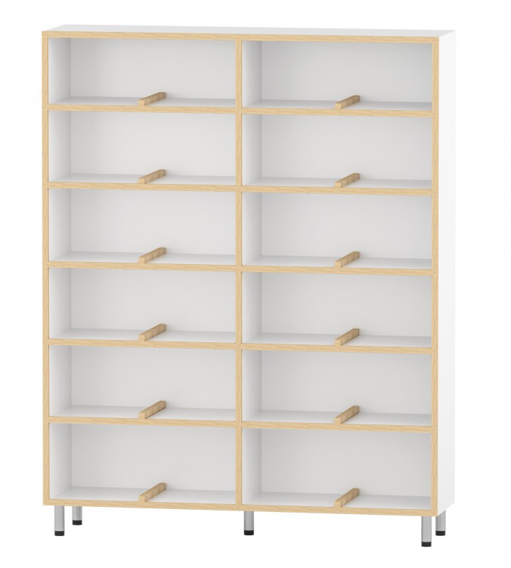 Cipőspolc bölcsődei átadó helyiségbe. Mérete: 120x30x140 cm - 12 rekeszes, benne fa elválasztókkal, így 24 pár kiscipő tárolását biztosítva. Anyaga: fehér laminált bútorlap keményfa élzárással. Fém lábakon áll. készreszerelt termék.