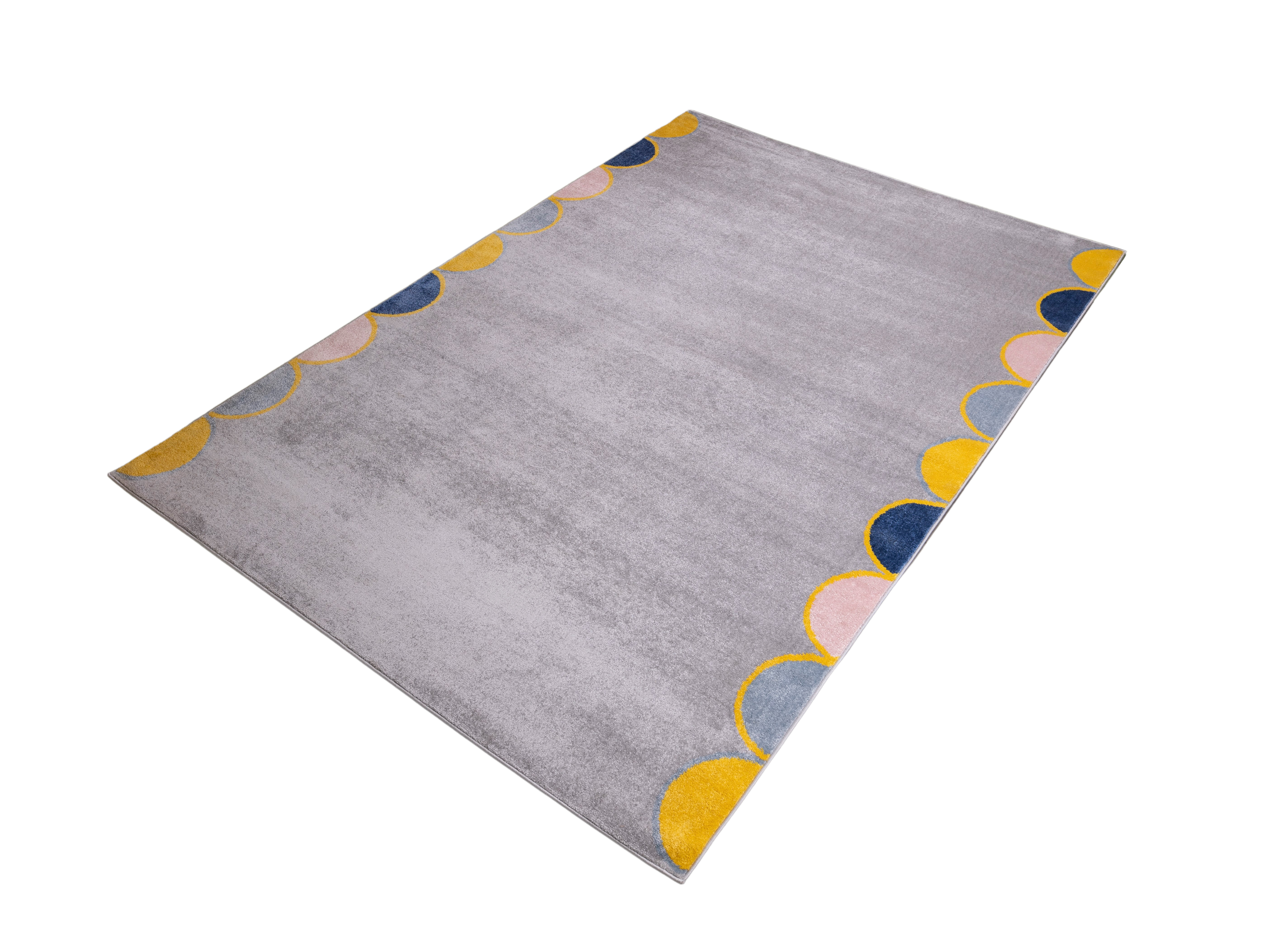 Termék mérete: 200x280 cm Kellemes, szürke alapszínű szőnyeg, melynek két szélén különböző színű félkörök helyezkednek el a következő színekben váltakozva: baba kék, pasztell rózsaszín, sötét kék, narancssárga. A félkörök lehetőséget adnak csoportos foglalkozásokra, melyben a gyerekek egy-egy félkört kiválasztva lekucorodhatnak. A szőnyeg többi felülete mintamentes. Strapabíró, könnyen kezelhető antiallergén és antisztatikus, szegett szőnyeg. Padlófűtéses felületre is kiválóan alkalmas. Száltípus: friese, 12 mm Súly: 2000 g/m2.