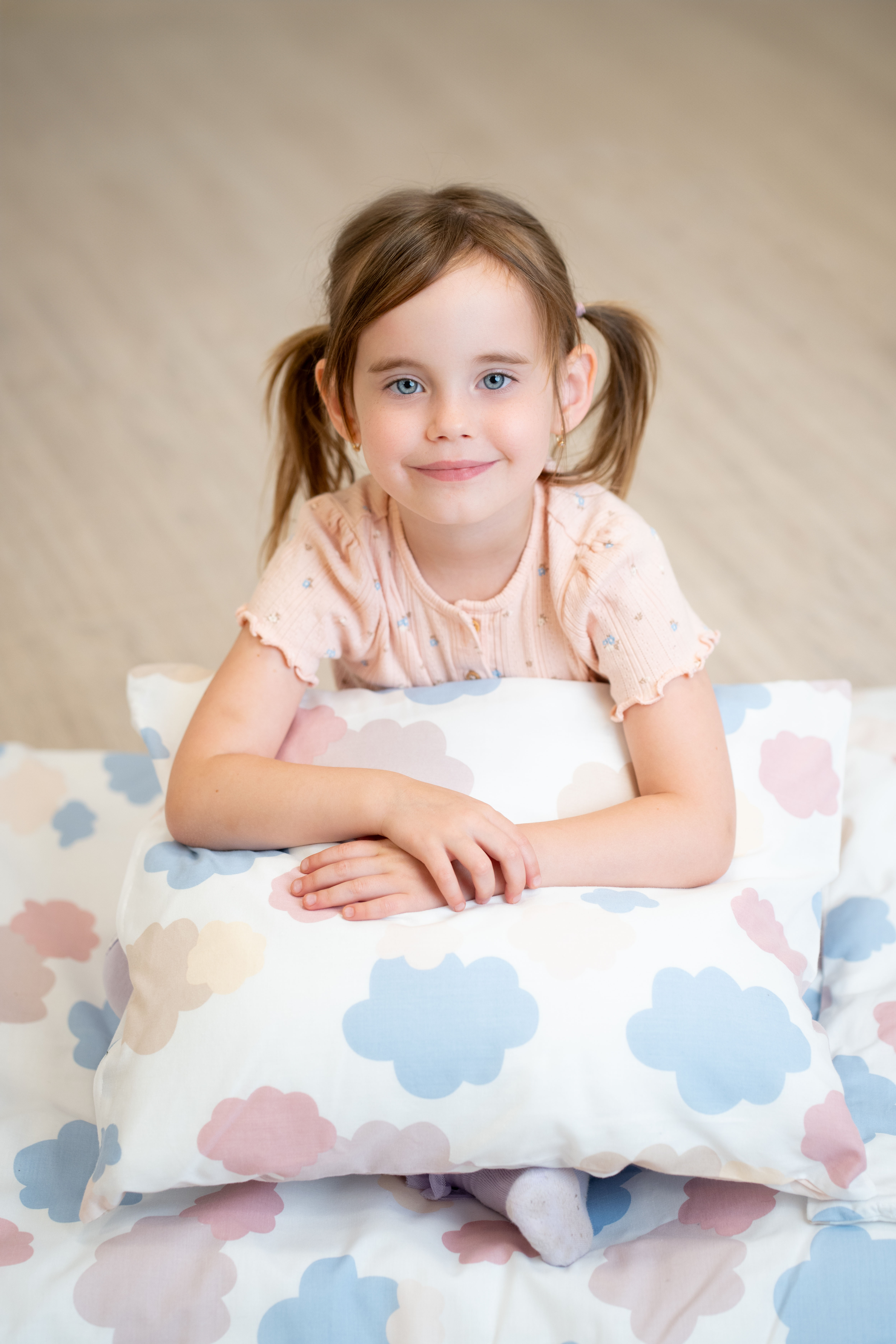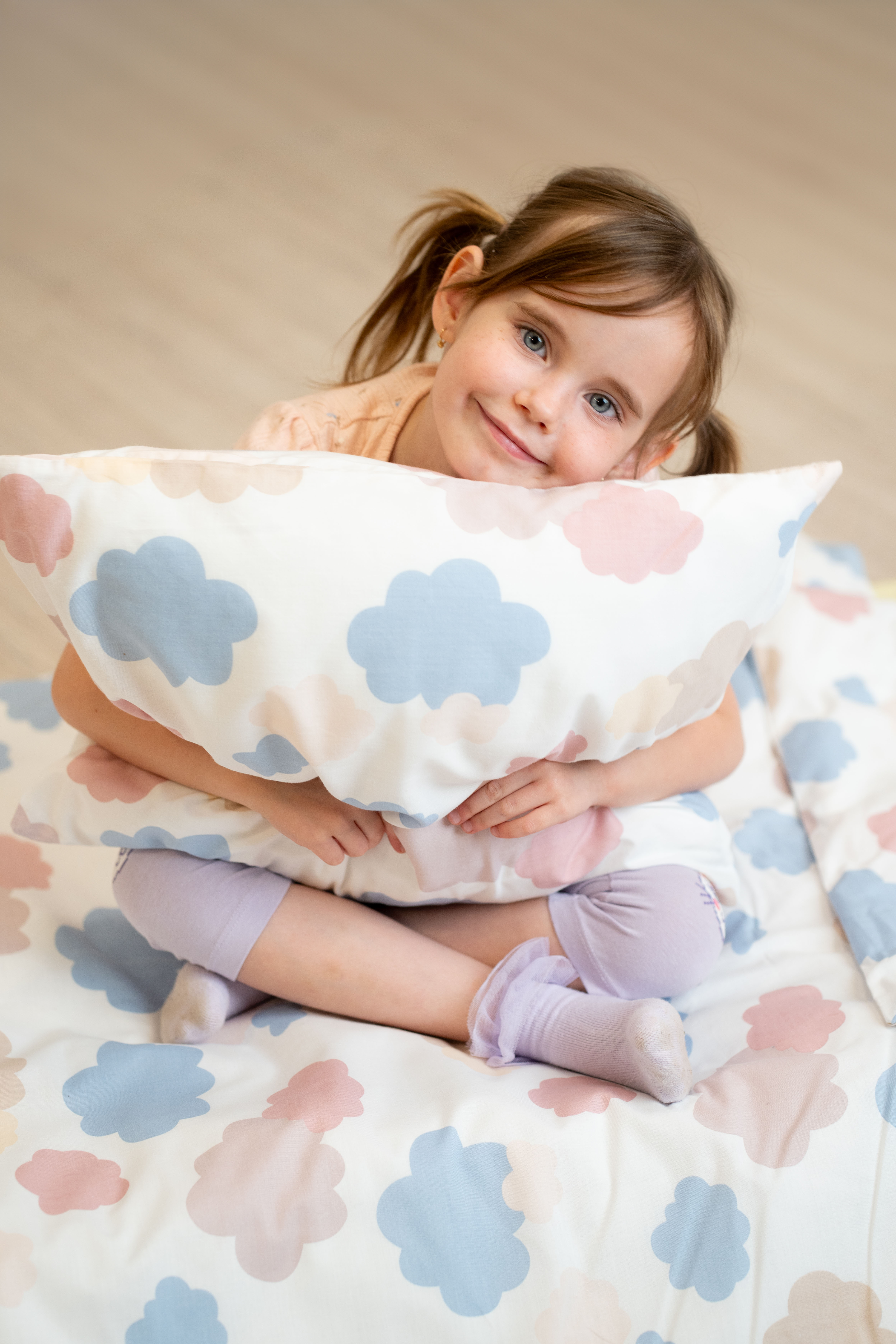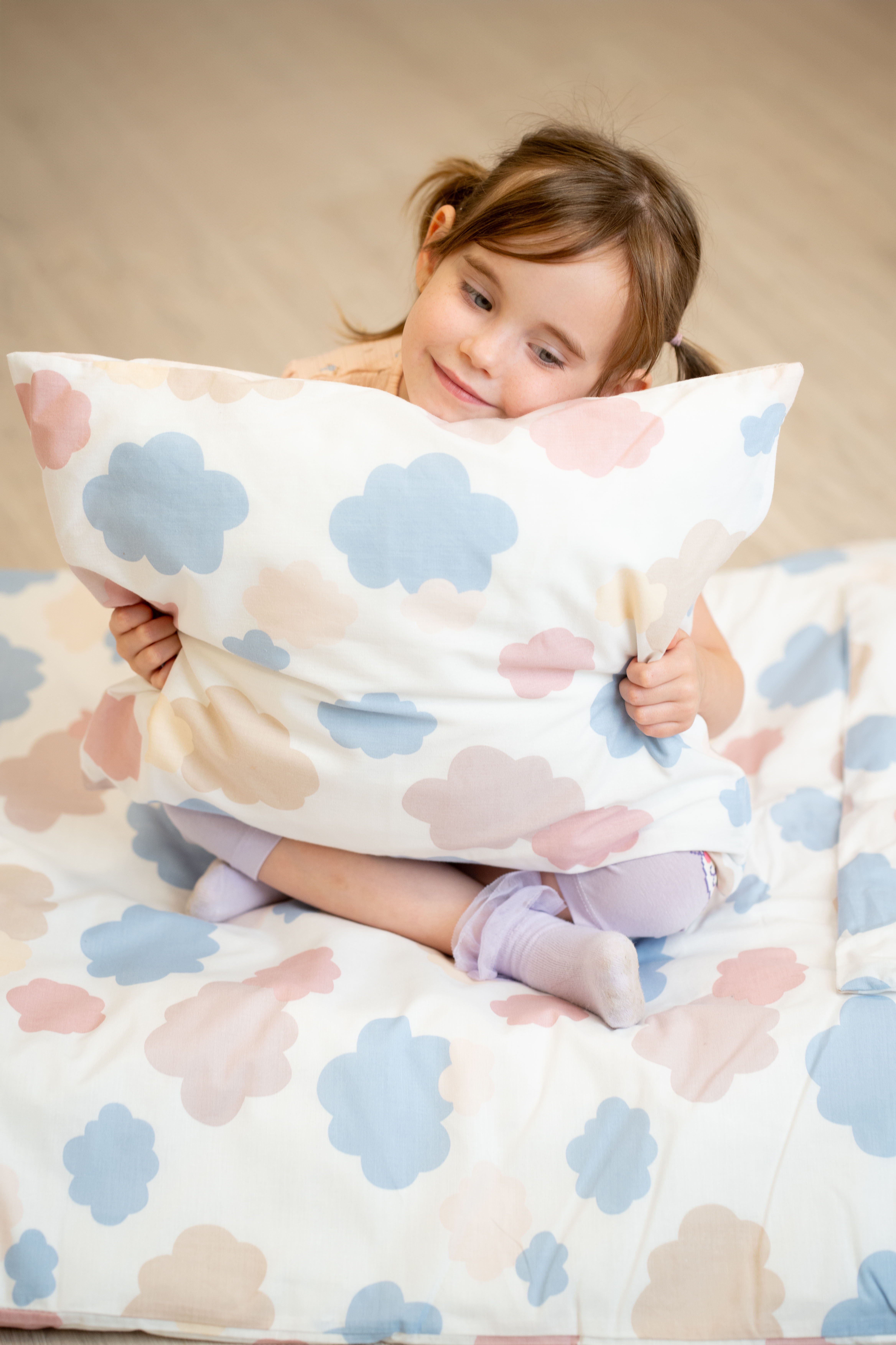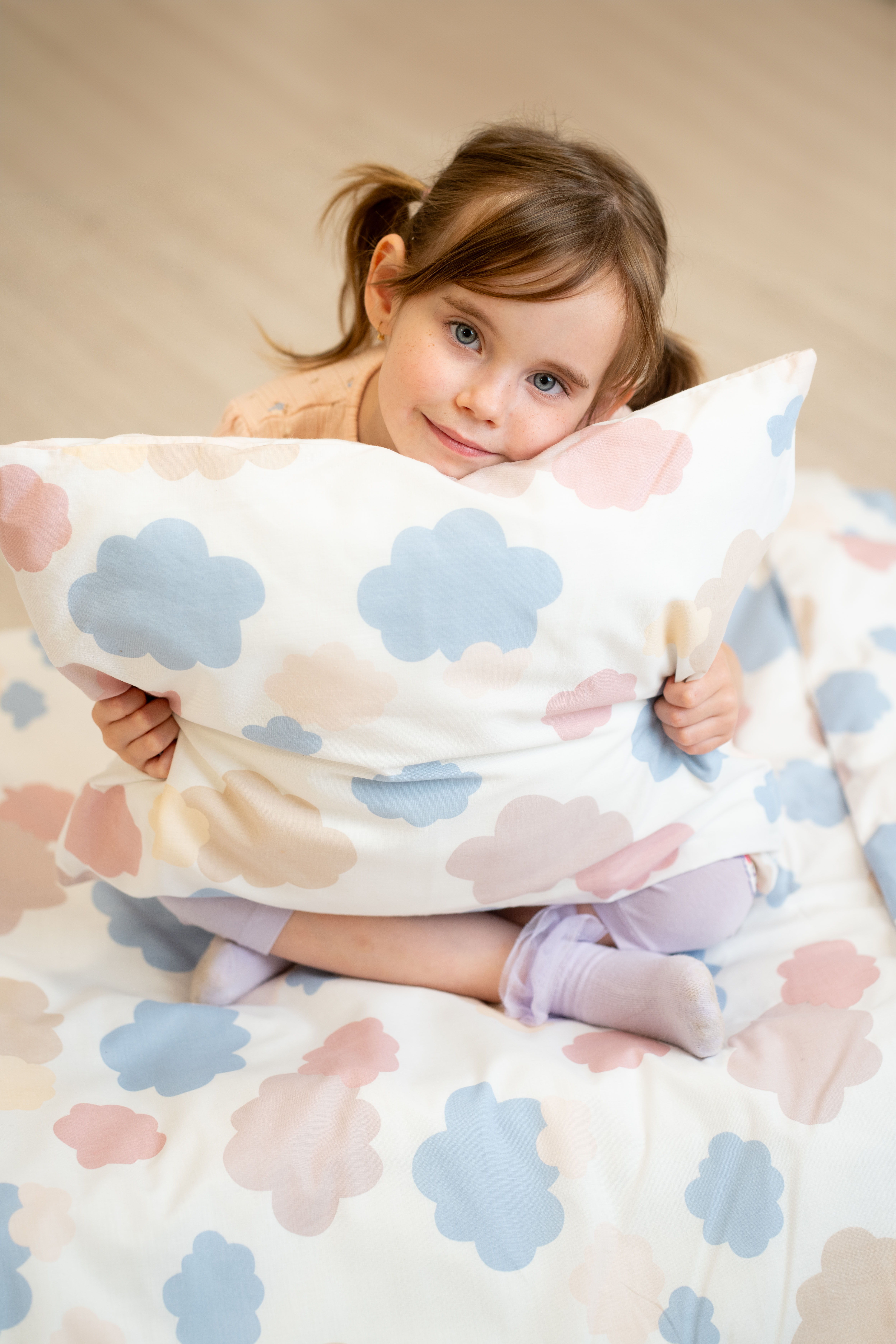 A vidám mintával ellátott ágyneműn színes felhőcskék láthatók.