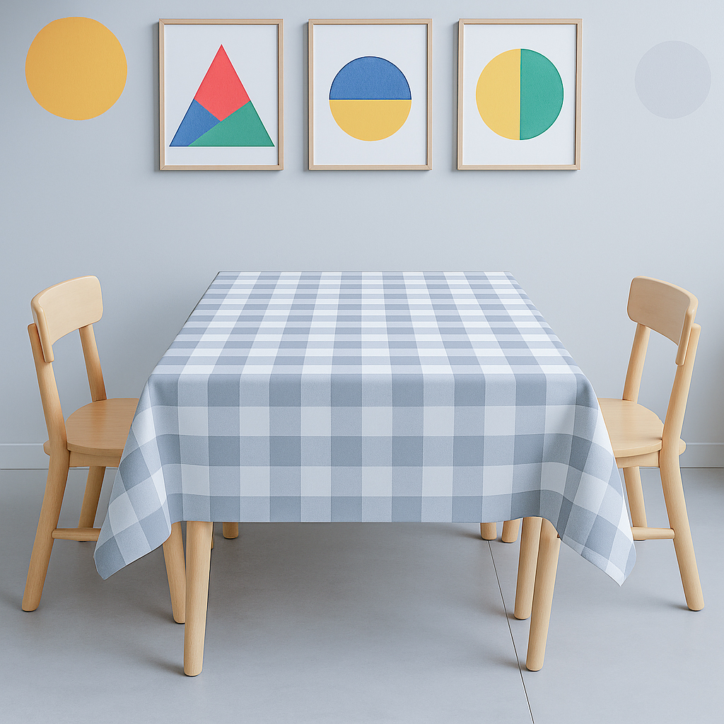 Puha, pamutvászon abrosz élénk világosszürke-fehér kockás mintával, amely barátságos, vidám hangulatot kölcsönöz a csoportszobának vagy az intézményi étkezőhelyiségeknek.