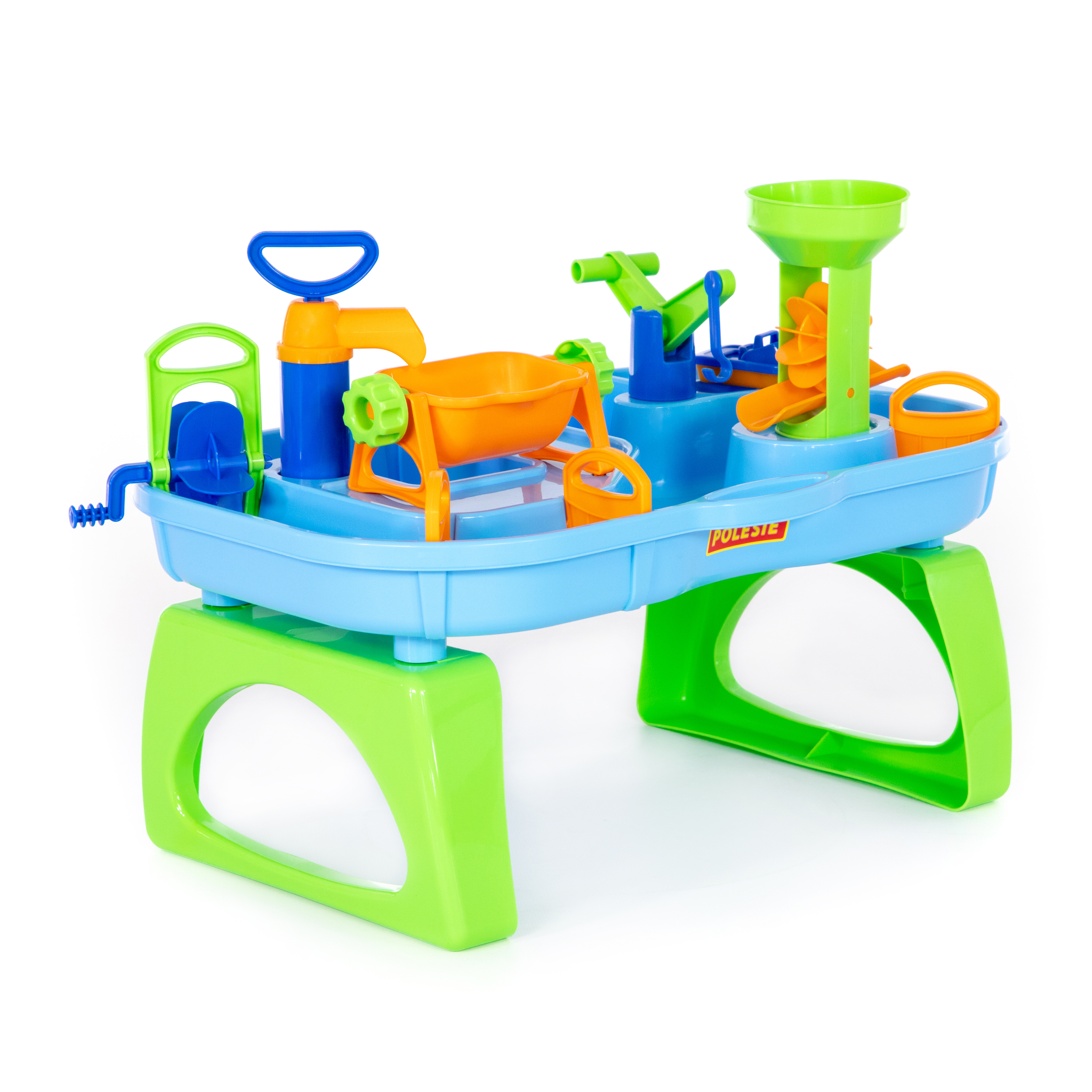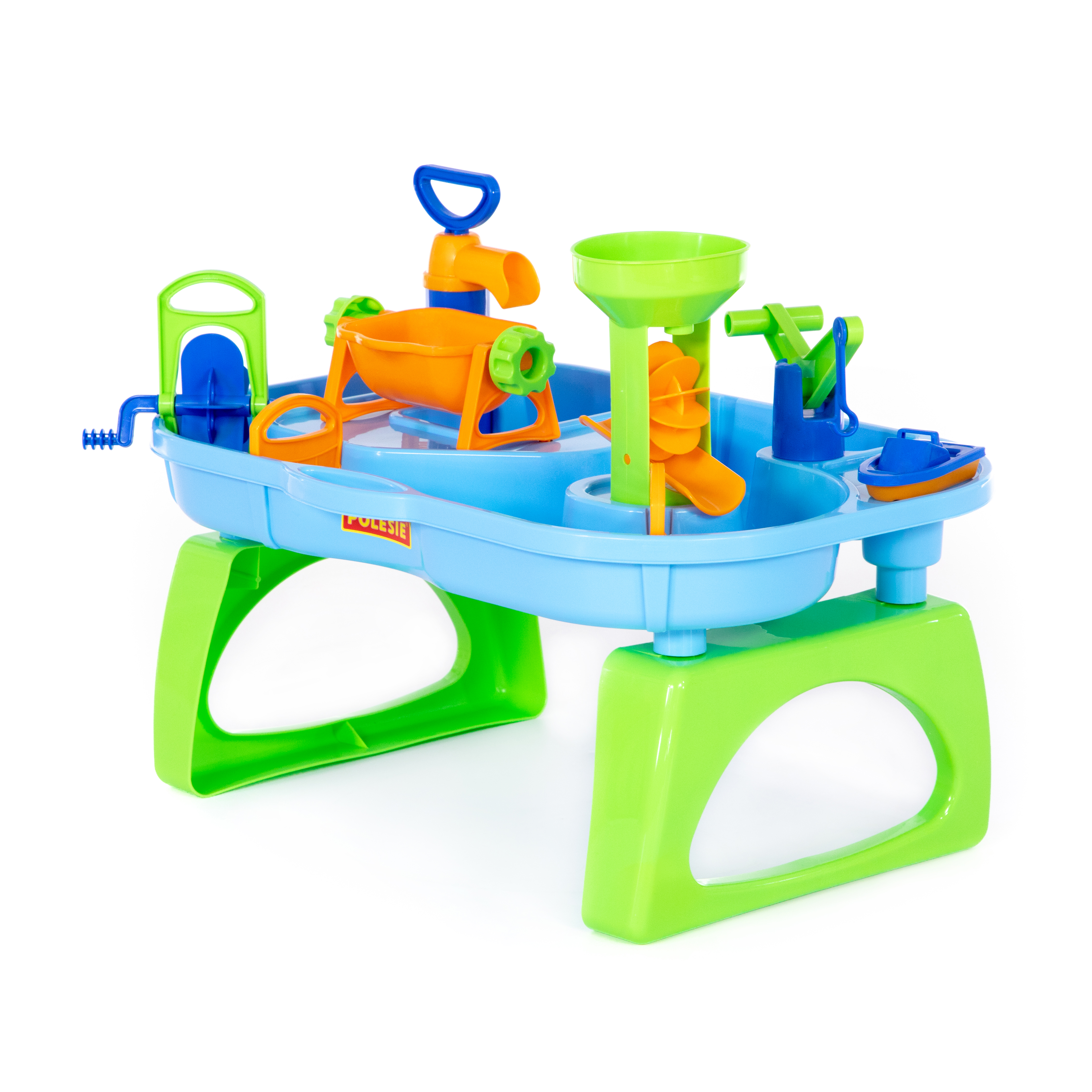 Ez a színes, vízi játék asztal egy komplett, beltéren és kültéren is használható vízipark, ahol csatornák, vízmalmok, kézi pumpa és daru mozgatják a kis hajókat. A gyerekek szabályozhatják a vízáramlást, forgathatják a malomkerekeket, sőt billentős tartállyal zúdíthatják a vizet a pályára – így minden öntés, pumpálás és gátnyitás látványos kísérletezésre ösztönöz. Könnyű, BPA-mentes műanyagból készült, ütésálló elemei tartósak, mégis lekerekített formájuk biztonságot nyújt már a legkisebb felfedezőknek is. Készlet tartalma: Vízasztal lábakkal, vízmalom, kézi pumpa csappal, daru kampóval, billenő tartály, csatornák és zárak, mini hajó Csomagolás mérete: 54x15x36,5 cm Termék mérete összeszerelve: 53x38x39 cm 12 hónapos korú gyermekek használatára CE minősítéssel ellátva! A játék többféle színben elérhető, a szín nem választható!