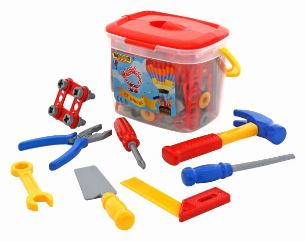 Tartalma: 72 darabos készlet. A praktikus tároló vödörben megtalálhatóak a következő szerszámok: kalapács, villáskulcs, reszelő, komináltfogó, csavarhúzó, vonalzó, kőműves kanál. A szerszámokon kívül sok-sok műanyag összecsavarozható elem, csavarok és anyacsavarok is találhatók. A műanyagvödör mérete: 24x19x18 cm