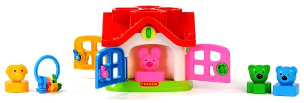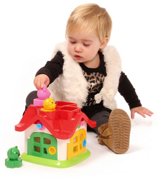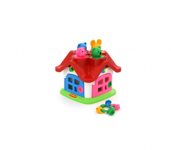 Tartalma: - 4 db figura formabedobó (sárga-kör-malac, rózsaszín-háromszög-egér, zöld-kereszt-cica, kék-négyzet-mackó) - 1 db kulcskarika 4 különböző színű és formájú kulccsal - 1 db formabedobó házikó, tetején 4 formabedobó nyílással, oldalain 4 nyitható ajtóval, az ajtók felett egy-egy gombbal. Az ajtók felett lévő gombokat egyenként négy különféle mozdulattal kell elmozdítaniuk (gomb benyomásával, kihúzásával, elcsavarásával vagy lenyomásával), hogy az állatkák beleessenek a házikóba. Nem csak szín- és formafelismerő, formabedobó, de még finommotorikus mozgást is fejlesztő játék. Termék mérete: 18,5x18,5x16 cm 12 hónapos korú gyermekek használatára CE minősítéssel ellátva!