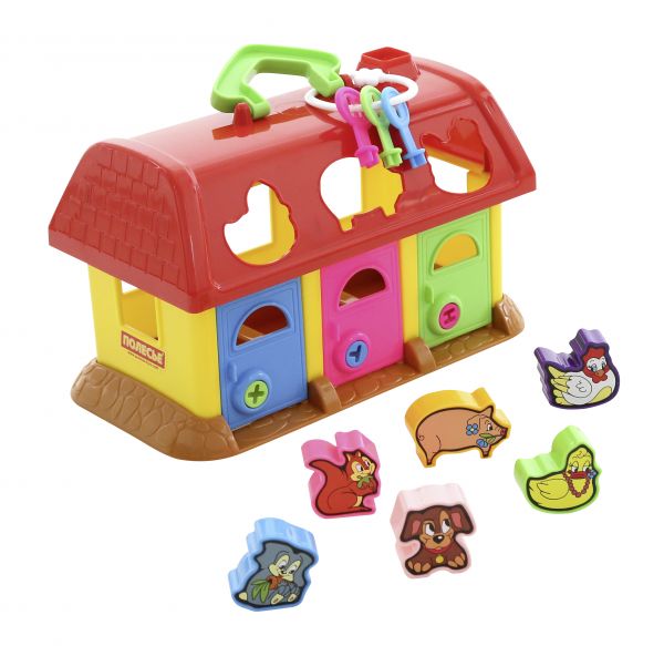 Tartalma: - 1 db kulcsos formabedobó házikó (6 különböző formájú nyílás a tetején, 3 különböző színű ajtó, melyek kinyitásához 3 különböző kulcs kell.) - 3 db kulcs egy kulcskarikán (a kulcsok színe megegyezik a zár színével - 6 db állatka forma (nyuszi, mókus, kutya, malac, kacsa, tyúk) - 1 db matrica készlet. Nem csak formabedobó játék, hanem a megfelelő kulcsok megtalálása miatt, szín- és formafelismerő, valamint finommotorikát fejlesztő játék is. A ház tetején lévő fogantyút használva könnyedén odébb lehet vinni és a kulcskarikát is rá lehet fűzni. Termék mérete:12,8x15,5x18,5 cm 12 hónapos korú gyermekek használatára CE minősítéssel ellátva!